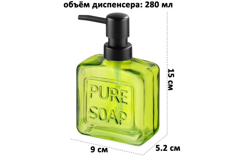 Диспенсер Elan Gallery "Салатовый" объёмом 280 мл и размером 9х5,2х15 см поможет организовать чистоту и уют в вашем доме. Выполнен из стекла и украшен надписью "Pure soap". Объём стеклянной бутылочки 280 мл позволит налить в неё достаточно средства, чтобы хватило для длительного использования. Дозатор диспенсера выполнен из пластика. Поскольку бутылка изготовлена из прозрачного стекла, вы можете контролировать уровень жидкости и вовремя пополнять её запас. Стильный органайзер подойдёт для использования на кухне или в ванной комнате. Налейте в него моющее средство, гель для мытья посуды или жидкое мыло. Эргономичная форма позволяет разместить флакон с дозатором на раковине или полке. В ванной можете использовать его для геля для душа или шампуня. Универсальную бутылочку с дозатором можно приспособить под антисептик. Просто поставьте её на стол, чтобы средство для дезинфекции было всегда под рукой. Ёмкость квадратной формы выполнена в стильном дизайне и подойдёт для любого интерьера. Инструкция: не применять абразивные моющие средства. Избегать регулярного прямого контакта с водой (например, не хранить в душевой кабинке или на полке возле душа). Поставляется в картонной упаковке. Настольный диспенсер — это не только практичное, но и стильное решение для организации чистоты и порядка в вашем доме.