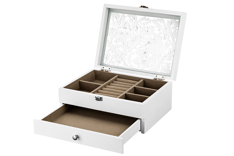 Шкатулка для украшений от Elan Gallery послужит универсальным органайзером для ювелирных изделий и бижутерии. Общий размер изделия – 26х18,5х8,5 см. Состоит из двух ярусов и откидной крышки. Верхний ярус включает три маленьких отделения, два средних, и один специальный отсек для колец. Нижний ярус представляет собой выдвижной ящичек свободного назначения. Крышка оснащена прозрачной пластиковой вставкой с узорным рельефным покрытием. Эстетичная коробочка белого цвета поможет навести порядок даже в богатой коллекции драгоценностей! Прочные разделители помогут сортировать аксессуары удобным для вас способом: по типу изделия, цвету или материалу. Разложите по отсекам кулоны, колье или цепочки из золота, серебра и других металлов. Отделение для колец также можно использовать для хранения серёг-колец или серёжек-гвоздиков. Заполните вместительный нижний ярус браслетами или наручными часами, а также декоративными изделиями, контейнерами с бусинами, швейными принадлежностями или любыми другими вещами. Такая шкатулка станет оригинальным подарком как для девочки-подростка, так и для женщины. Подарите её маме, бабушке или подруге, чтобы порадовать их стильным и практичным дополнением хозяйственного инвентаря. Нежный и эстетичный дизайн гармонично впишет изделие в любой интерьер, позволяя хранить коробку даже на открытой полке. Это особенно удобно для тех, кто пользуется украшениями ежедневно. Поставляется в прочной картонной упаковке. В коллекции бренда Элан Галерея вы найдет большой ассортимент товаров для дома, которые помогут вам организовать бережную систему хранения ваших вещей!