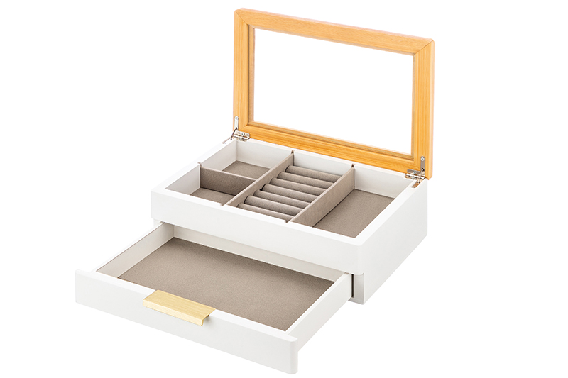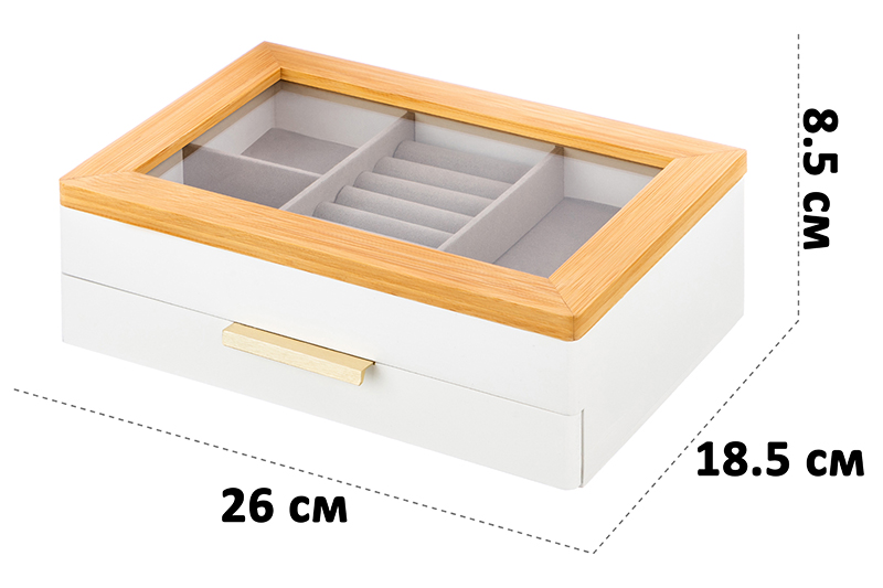 Шкатулка для украшений от Elan Gallery послужит универсальным органайзером для ювелирных изделий и бижутерии. Общий размер изделия – 26х18,5х8,5 см. Состоит из двух ярусов и откидной бамбуковой крышки. Верхний ярус включает два маленьких отделения, одно большое, и один специальный отсек для колец. Нижний ярус представляет собой выдвижной ящичек свободного назначения. Эстетичная коробочка белого цвета поможет навести порядок даже в богатой коллекции драгоценностей! Прочные разделители помогут сортировать аксессуары удобным для вас способом: по типу изделия, цвету или материалу. Разложите по отсекам кулоны, колье или цепочки из золота, серебра и других металлов. Отделение для колец также можно использовать для хранения серёг-колец или серёжек-гвоздиков. Заполните вместительный нижний ярус браслетами или наручными часами, а также декоративными изделиями, контейнерами с бусинами, швейными принадлежностями или любыми другими вещами. Прозрачное окошко из пластика позволит вам увидеть содержимое верхнего ящика даже под закрытой крышкой. Такая шкатулка станет оригинальным подарком как для девочки-подростка, так и для женщины. Подарите её маме, бабушке или подруге, чтобы порадовать их стильным и практичным дополнением хозяйственного инвентаря. Нежный и эстетичный дизайн гармонично впишет изделие в любой интерьер, позволяя хранить коробку даже на открытой полке. Это особенно удобно для тех, кто пользуется украшениями ежедневно. Поставляется в прочной картонной упаковке. В коллекции бренда Элан Галерея вы найдет большой ассортимент товаров для дома, которые помогут вам организовать бережную систему хранения ваших вещей!
