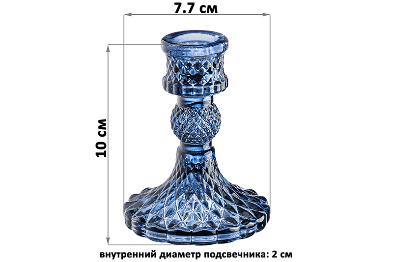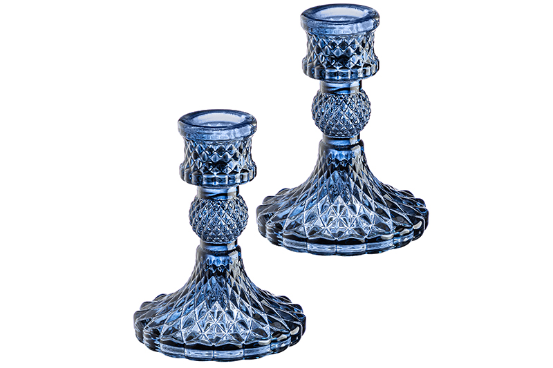 Набор 2 подсвечников размером 7,7x7,7x10 см выполнен из синего стекла и прекрасно дополнит интерьер вашей комнаты, гостиной или спальни. Внутренний диаметр каждого – 2 см. Поверхность украшена геометрическим орнаментом в виде ромбиков разного размера, что придаёт ему стильный и изысканный вид. Глубокая чашечка с высокими бортиками не допускает протечки горячего воска и гарантирует плотную посадку свечи. Благодаря этому подсвечник подойдёт для высоких свечей. Он поможет создать приятную атмосферу для романтического вечера. Оригинальный дизайн сделает его прекрасным элементом декора, и он привнесёт уют в квартиру или кабинет. Будет отлично сочетаться с другими аксессуарами для создания декоративных композиций. Станет ярким украшением стола на любой праздник: Новый год, Рождество, день рождения или свадьбу. Не рекомендуется применять абразивные моющие средства. Поставляется в картонной коробке. Такой подсвечник будет необычным и желанным подарком для жены или матери.