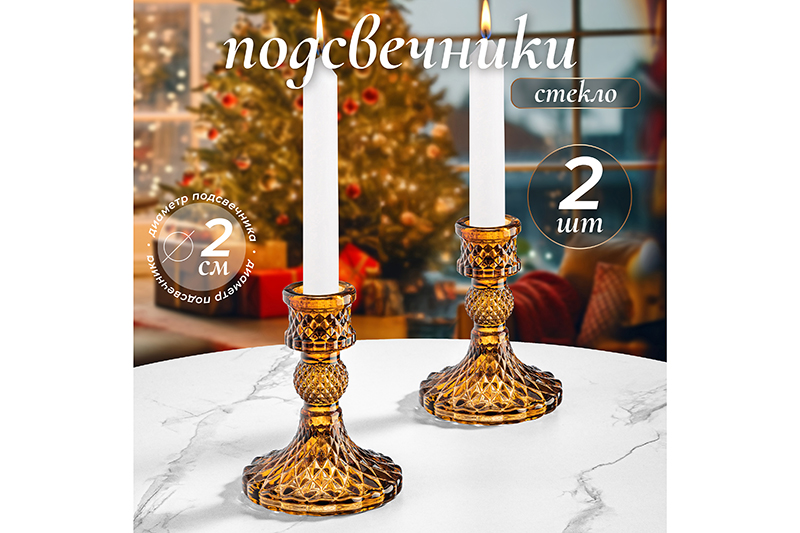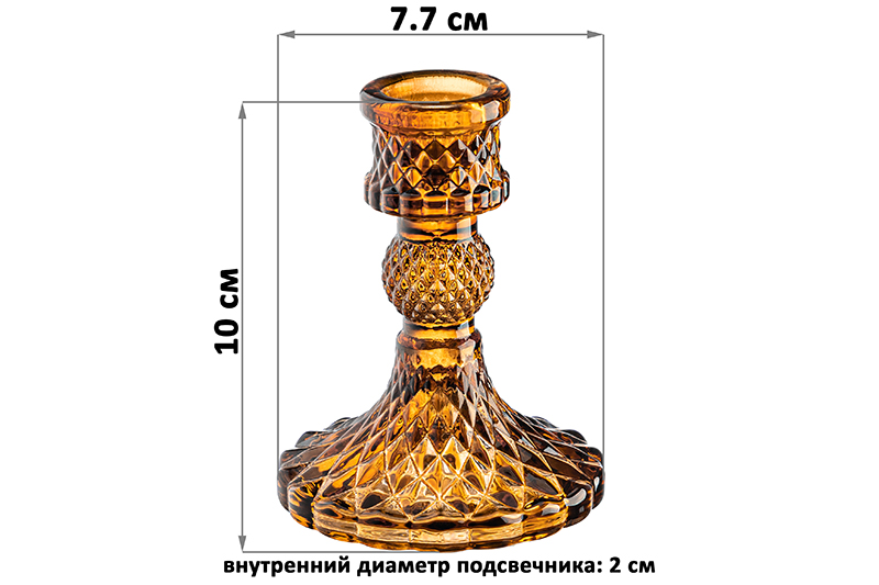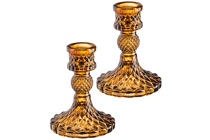 Набор 2 подсвечников размером 7,7x7,7x10 см выполнен из стекла янтарного цвета и прекрасно дополнит интерьер вашей комнаты, гостиной или спальни. Внутренний диаметр каждого – 2 см. Поверхность украшена геометрическим орнаментом в виде ромбиков разного размера, что придаёт ему стильный и изысканный вид. Глубокая чашечка с высокими бортиками не допускает протечки горячего воска и гарантирует плотную посадку свечи. Благодаря этому подсвечник подойдёт для высоких свечей. Он поможет создать приятную атмосферу для романтического вечера. Оригинальный дизайн сделает его прекрасным элементом декора, и он привнесёт уют в квартиру или кабинет. Будет отлично сочетаться с другими аксессуарами для создания декоративных композиций. Станет ярким украшением стола на любой праздник: Новый год, Рождество, день рождения или свадьбу. Не рекомендуется применять абразивные моющие средства. Поставляется в картонной коробке. Такой подсвечник будет необычным и желанным подарком для жены или матери.