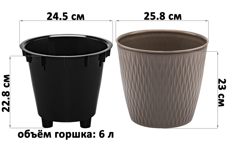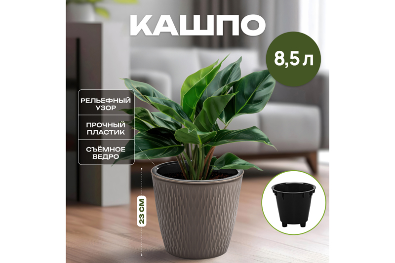 Кашпо от бренда ELCASA предназначено для украшения любого пространства живыми растениями и цветами. Благодаря универсальному размеру будет хорошо смотреться как на столе, так и на полу. Состоит из 2-х частей: внешней подставки серо-коричневого оттенка с рельефными узорами и внутреннего съёмного горшка чёрного цвета. Размер внешнего кашпо – 25,8х25,8х23 см, объём – 8,5 литра, диаметр дна – 17,5 см. Размер ведра-вкладыша – 24,5х24,5х22,8 см, объём – 6 литров. Все изделия выполнены из полипропилена – прочного пластика, который не содержит бисфенол А и другие вредные вещества. Горшочек снаружи покрыт краской, устойчивой к ультрафиолету, поэтому пригоден для использования как дома, так и на улице. Разместите на даче, балконе или террасе – горшок не выгорит на солнце и надолго сохранит привлекательный вид. Подойдёт как для искусственных цветочных композиций, так и для живых комнатных цветов. Горшочек с цветком украсит не только квартиру, но и сад. В пластиковой вазе будут изящно смотреться фикус, папоротник и орхидея. Используйте как настольное или напольное кашпо, чтобы создать в комнате атмосферу тепла и уюта. Горшок для цветов займёт прекрасное место на вашей кухне, добавив интерьеру очарования благодаря наличию живых растений. Ёмкость из прочного материала достаточно устойчива, но при необходимости на дне можно расположить утяжелители (не входят в набор). Не рекомендуется применять абразивные моющие средства. Декоративное кашпо от ЭЛЬКАСА станет украшением вашего дома, сада или офиса и поможет создать в них гармонию и уют!