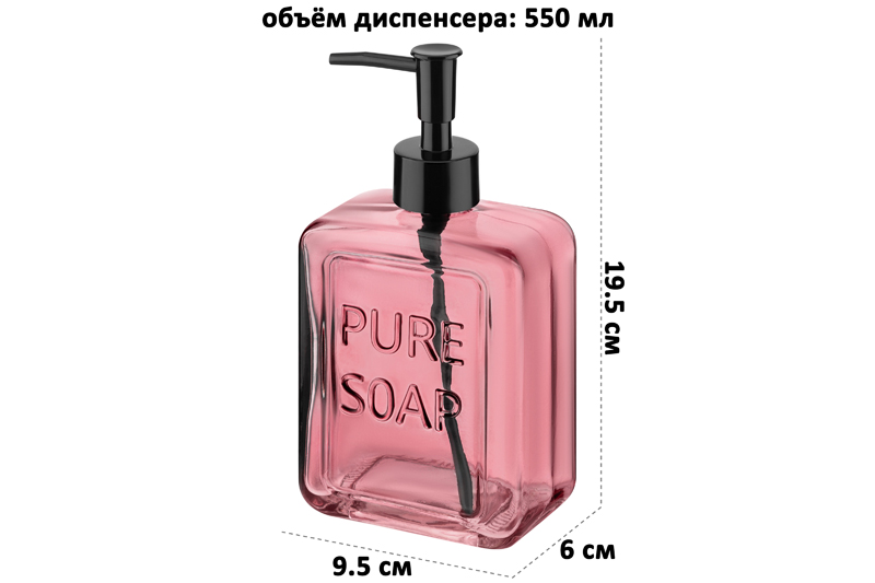 Диспенсер Elan Gallery "Розовый" объёмом 550 мл и размером 6х9,5х19,5 см поможет организовать чистоту и уют в вашем доме. Выполнен из стекла и украшен надписью "Pure soap". Объём стеклянной бутылочки 550 мл позволит налить в неё достаточно средства, чтобы хватило для длительного использования. Дозатор диспенсера выполнен из пластика. Поскольку бутылка изготовлена из прозрачного стекла, вы можете контролировать уровень жидкости и вовремя пополнять её запас. Стильный органайзер подойдёт для использования на кухне или в ванной комнате. Налейте в него моющее средство, гель для мытья посуды или жидкое мыло. Эргономичная форма позволяет разместить флакон с дозатором на раковине или полке. В ванной можете использовать его для геля для душа или шампуня. Универсальную бутылочку с дозатором можно приспособить под антисептик. Просто поставьте её на стол, чтобы средство для дезинфекции было всегда под рукой. Ёмкость квадратной формы выполнена в стильном дизайне и подойдёт для любого интерьера. Инструкция: не применять абразивные моющие средства. Избегать регулярного прямого контакта с водой (например, не хранить в душевой кабинке или на полке возле душа). Поставляется в картонной упаковке. Настольный диспенсер — это не только практичное, но и стильное решение для организации чистоты и порядка в вашем доме.