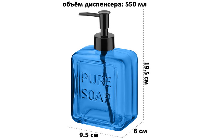Диспенсер Elan Gallery "Синий" объёмом 550 мл и размером 6х9,5х19,5 см поможет организовать чистоту и уют в вашем доме. Выполнен из стекла и украшен надписью "Pure soap" ("Чистое мыло"). Объём стеклянной бутылочки 550 мл позволит налить в неё достаточно средства, чтобы хватило для длительного использования. Дозатор диспенсера выполнен из пластика. Поскольку бутылка изготовлена из прозрачного стекла, вы можете контролировать уровень жидкости и вовремя пополнять её запас. Стильный органайзер подойдёт для использования на кухне или в ванной комнате. Налейте в него моющее средство, гель для мытья посуды или жидкое мыло. Эргономичная форма позволяет разместить флакон с дозатором на раковине или полке. В ванной можете использовать его для геля для душа или шампуня. Универсальную бутылочку с дозатором можно приспособить под антисептик. Просто поставьте её на стол, чтобы средство для дезинфекции было всегда под рукой. Ёмкость квадратной формы выполнена в стильном дизайне и подойдёт для любого интерьера. Инструкция: не применять абразивные моющие средства. Избегать регулярного прямого контакта с водой (например, не хранить в душевой кабинке или на полке возле душа). Поставляется в картонной упаковке. Настольный диспенсер — это не только практичное, но и стильное решение для организации чистоты и порядка в вашем доме.