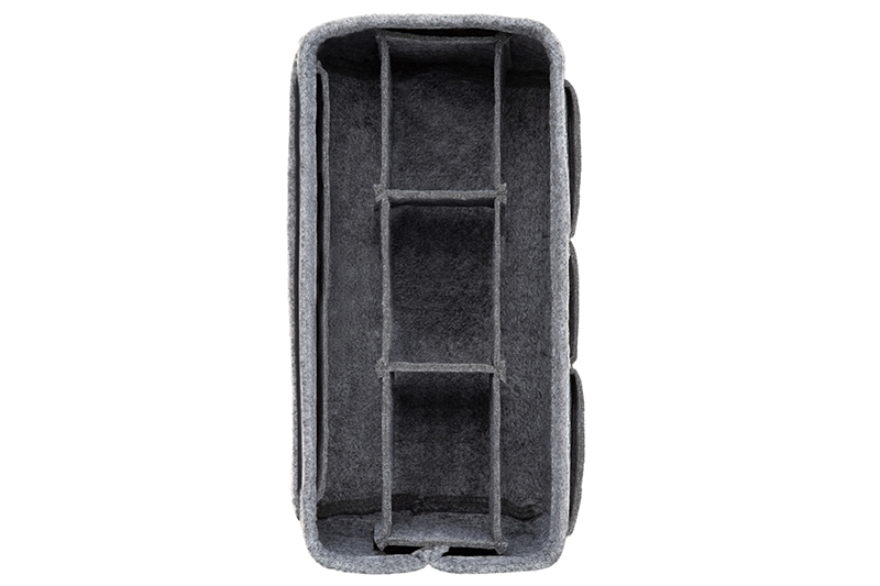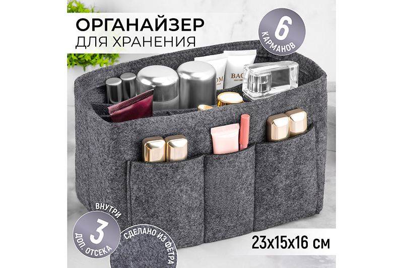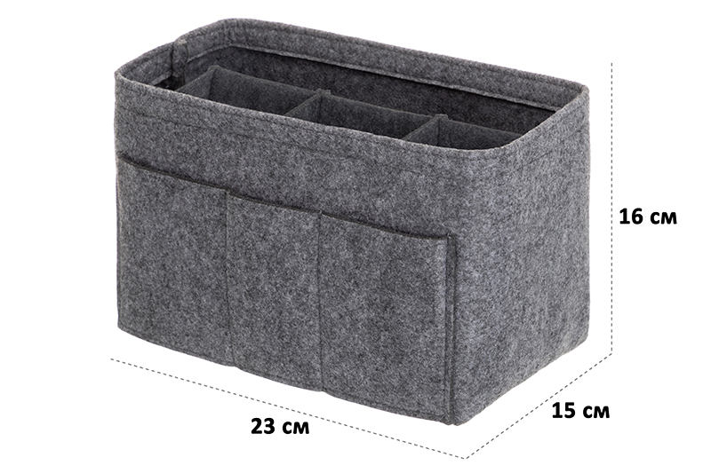 Складной органайзер изготовлен из серого фетра и подойдёт для хранения небольших предметов. Размер изделия – 23х15х16 см. Органайзер имеет шесть пришитых карманов разного размера: четыре внешних и два внутренних. Внутрь органайзера помещён разделитель с тремя дополнительными отсеками. Он крепится к стенкам с помощью прочных липучек. При желании разделитель можно снять и освободить место для хранения аксессуаров, сложенных платков или перчаток. Поместится даже записная книжка! Органайзер с разделителем подойдёт для хранения бижутерии, резинок для волос, ниток или предметов канцелярии. Поставьте его на стол или тумбочку, чтобы всё необходимое всегда было под рукой. Лёгкий складной органайзер удобно взять с собой. Благодаря этому он послужит вам не только дома, но и на работе и даже в дороге. Не рекомендуется применять абразивные моющие средства. Органайзер станет практичным дополнением интерьера вашей квартиры.