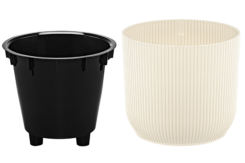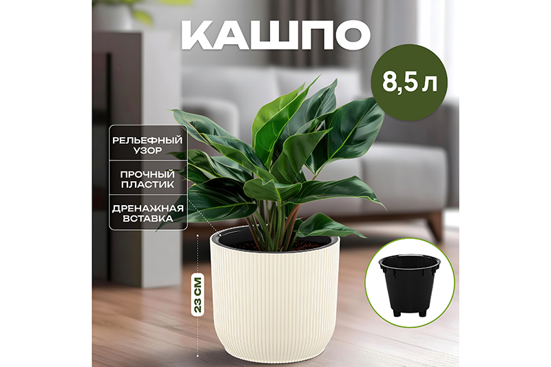 Кашпо 26×26×23 см в оттенке слоновая кость от бренда ELCASA — это удобное интерьерное решение для квартиры или дачи. Можно использовать как напольное или настольное. Объём ёмкости 8,5 литров. Диаметр дна 20 см. Снаружи горшок украшен рельефным узором в виде вертикальных полосок. Универсальный дизайн подходит под любой интерьер, а минималистичный узор и красивый оттенок придают пластиковому изделию эстетики. Внутри кашпо оснащено дренажной вставкой размером 24,5×24,5×22 см. Она представляет собой внутреннее ведёрко чёрного цвета, которое имеет 3 отверстия на дне. Это удобно при поливе комнатных цветов и садовых композиций из живых растений, так как можно избавиться от застоя воды. Излишки будут стекать во внешнюю декоративную ёмкость цвета слоновой кости. При необходимости можно вытащить вставку с цветком, а излишки жидкости быстро слить из внешней ёмкости. Изделие выполнено из прочного и экологичного пластика – полипропилена. Материал устойчив к влаге и другим внешним воздействиям, благодаря чему цветочный горшочек можно использовать на улице. Подойдёт для украшения живыми цветами сада, балкона или террасы. Эстетично смотрится на подоконнике, столе и даже на полу. Создайте уютную зону отдыха в любом помещении, украсив её декоративными растениями. Благодаря универсальному дизайну подойдёт под любой стиль интерьера городской квартиры, а также гармонично впишется в атмосферу загородного участка как уличное кашпо. Не рекомендуется применять абразивные моющие средства. Беречь от механических повреждений. Станет приятным подарком на любой праздник. В коллекции бренда ELCASA представлено много функциональных товаров для дома, садоводства и предметов декора. Выберите варианты на свой вкус!
