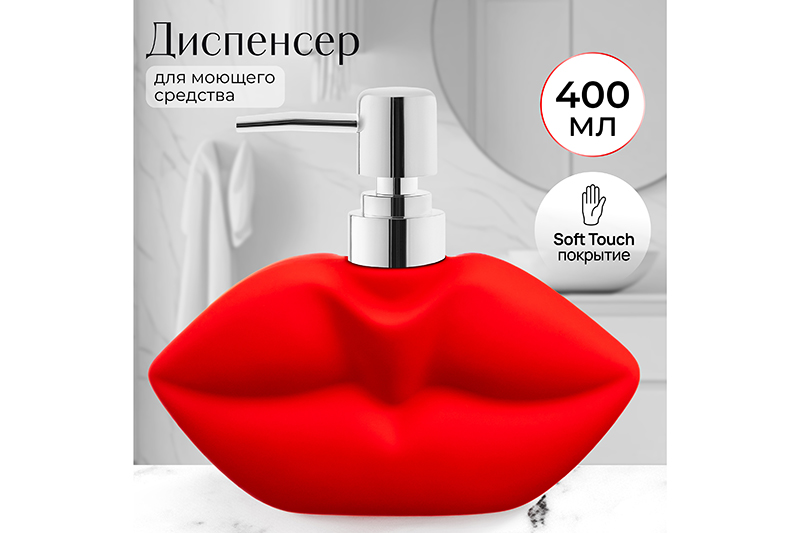 Диспенсер Elan Gallery в виде алых губ объёмом 400 мл и размером 17х7х14 см поможет организовать чистоту и уют в вашем доме. Яркий аксессуар в ванной или на кухне добавит красок в интерьер. Фигурная бутылочка выполнена из керамики. Имеет матовый финиш, создающий эффект soft-touch. Дозатор серебристого цвета изготовлен из пластика. Высота без дозатора 9,5 см. Объём керамической ёмкости 400 мл позволит налить в неё достаточно средства, чтобы хватило для длительного использования. Дозатор легко снимается и одевается, выдает нужную порцию мыла. Стильный органайзер подойдёт для использования на кухне или в ванной комнате. Налейте в него моющее средство, гель для мытья посуды или жидкое мыло. Эргономичная форма позволяет разместить флакон с дозатором на раковине или полке. В ванной можете использовать его для геля для душа или шампуня. Универсальную бутылочку с дозатором можно приспособить под антисептик. Просто поставьте её на стол, чтобы средство для дезинфекции было всегда под рукой. Ёмкость в форме красных женских губ украсит интерьер любого пространства. Не рекомендуется применять абразивные моющие средства. Нельзя мыть в посудомоечной машине. Поставляется в красочной картонной коробке. Станет оригинальным подарком на любой праздник. Благодаря фирменной коробочке не понадобится дополнительная подарочная упаковка. Настольный диспенсер — это не только практичное, но и стильное решение для организации чистоты и порядка в вашем доме. В коллекции бренда Элан Галерея представлено много стильных товаров для дома, в том числе эстетичных принадлежностей для хранения различных жидкостей или крема. Выберите вариант на свой вкус!