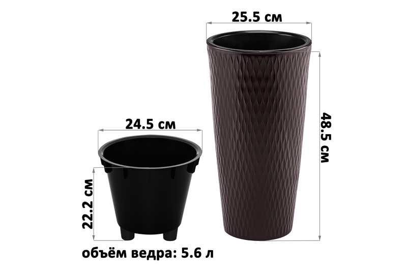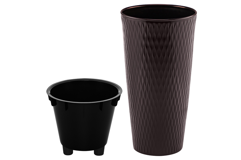 Напольное кашпо для цветов от ELCASA предназначено для организации пространства в вашем доме. Состоит из 2-х частей: внешней высокой подставки цвета венге и внутреннего съёмного горшка чёрного цвета. Размер кашпо – 25,5х25,5х48,5 см, объём – 15,5 литров, размер дна – 17х17 см. Размер ведра-вкладыша – 24,5х24,5х22,2 см, объём – 5,6 литров. Выполнено из полипропилена – прочного пластика, который не содержит бисфенол А и другие вредные вещества. Подойдёт под любой цветок. Ваза со вставкой покрыта краской, устойчивой к ультрафиолету, поэтому пригодна для использования как дома, так и на улице. Разместите кашпо на даче или балконе – горшочек не выгорит на солнце и долго прослужит. Большая пластиковая подставка имеет стильную круглую форму и сможет украсить не только квартиру, но и сад. Кашпо подойдёт как для искусственных, так и для живых комнатных цветов. В интерьерной вазе будет изящно смотреться пальма, фикус, папоротник и орхидея. Поставьте её на пол или посадите в неё своё любимое деревце, чтобы создать в комнате атмосферу тепла и уюта. Большой горшок для цветов займёт прекрасное место на вашей кухне, добавив интерьеру очарования благодаря наличию живых растений. Кашпо из прочного материала достаточно устойчиво, но при необходимости на дне можно расположить утяжелители (не входят в набор). Не рекомендуется применять абразивные моющие средства. Декоративное кашпо от ЭЛЬКАСА станет украшением вашего дома, сада или офиса и поможет создать в них гармонию и уют!