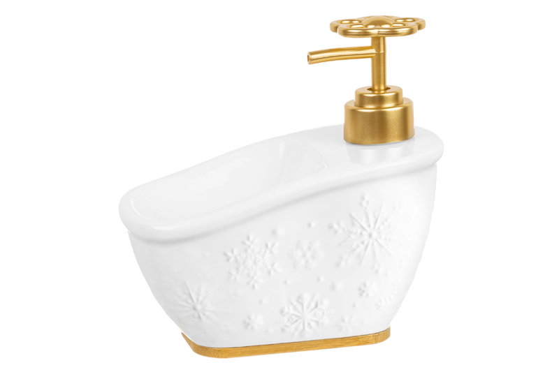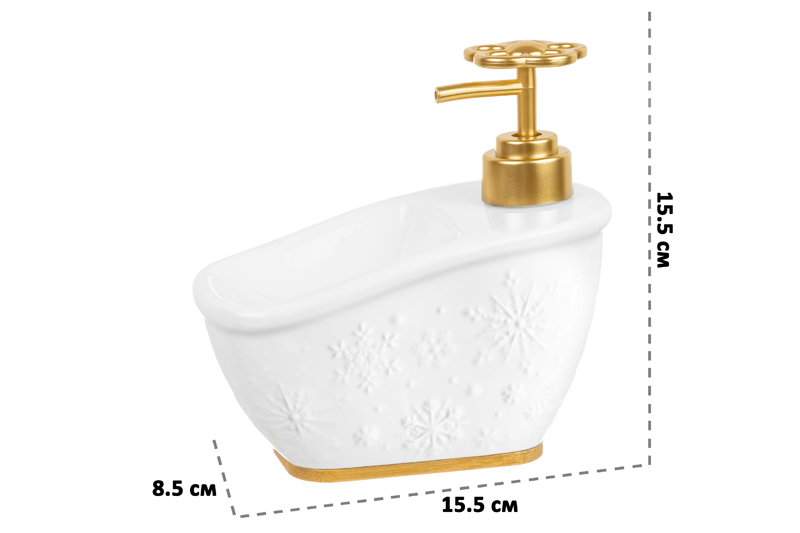 Диспенсер “Снежинки” подойдёт для хранения жидких моющих и очищающих средств. Размер изделия – 15,5х8,5х15,5 см, объём – 500 мл. Выполнен из высококачественного белого фарфора и украшен рельефными узорами в виде снежинок. Фарфор легко отмывается. Дозатор золотого цвета изготовлен из пластика. Изящный диспенсер найдёт своё место в любой части вашего дома. Залейте в ёмкость жидкое мыло, средство для посуды или антисептик. Можете наполнить его гелем для душа или шампунем и поставить в ванной. Углубление на поверхности подойдёт для хранения мыла или губки, идущей в комплекте. Не рекомендуется применять абразивные моющие средства. Нельзя использовать в посудомоечной машине. Поставляется в красивой картонной упаковке. Диспенсер станет прекрасным подарком на Новый год или Рождество и стильным дополнением вашего хозяйственного инвентаря. Новогодняя серия “Снежинки” украсит ваш дом в зимние праздники и поможет создать атмосферу уюта.