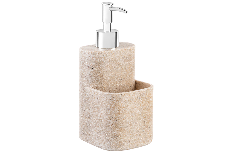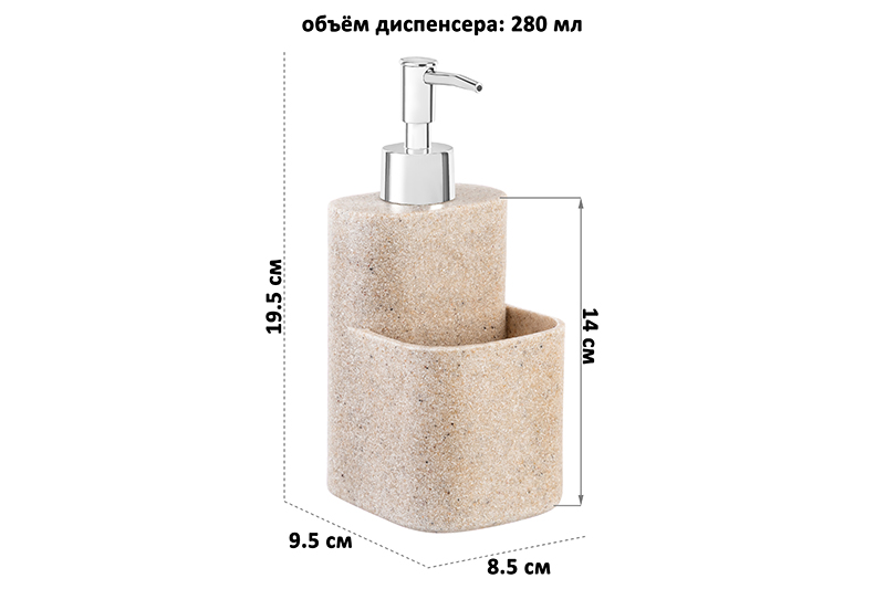 Настольный диспенсер от Elan Gallery подойдёт для хранения жидких моющих и очищающих средств. Размер изделия – 8,5х9,5х19,5 см, объём – 280 мл. Высота без дозатора – 14 см. Выполнен из полирезина – современного материала, отличающегося лёгкостью и устойчивостью к влаге. Он не выделяет вредных веществ и не впитывает посторонние запахи. Благодаря высокой прочности изделие надолго сохранит привлекательный внешний вид. Бежевая поверхность имеет песочный эффект. Дозатор серебристого цвета выполнен из пластика. Он герметичен и надёжно предотвращает проливание. Благодаря красивому дизайну и необычной форме баночка найдёт место в любой части вашей квартиры. Заполните ёмкость жидким мылом или средством для посуды и расположите на кухонной раковине. Имеется отделение для губки – с ним вы можете компактно хранить всё необходимое для мытья посуды. В ванной используйте флакон под гель для душа или шампунь. Универсальную бутылочку можно приспособить под антисептик. Поставьте её на рабочий стол в своей комнате или кабинете, чтобы дезинфицирующее средство было под рукой. Дополнительное отделение можно применить для хранения салфеток, тряпочки для протирки экрана или мелких канцелярских принадлежностей. Не рекомендуется применять абразивные моющие средства. Не подходит для использования в посудомоечной машине. Для очистки изделия воспользуйтесь тёплой водой с добавлением моющего средства. Поставляется в дизайнерской картонной коробке – вам не потребуется дополнительная подарочная упаковка. Декоративный диспенсер от бренда Элан Галерея станет отличным подарком для родных и близких. Это не только практичный, но и эстетичный аксессуар для поддержания гигиены, подходящий под любой интерьер!