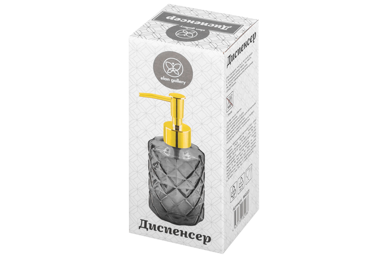 Стеклянный диспенсер подойдёт для хранения жидких моющих и очищающих средств. Размер изделия – 7,3х7,3х18 см, объём – 330 мл. Полупрозрачная поверхность диспенсера имеет графитовый цвет и украшена рельефным геометрическим узором. Дозатор золотого цвета изготовлен из пластика. Стильная баночка найдёт своё место на кухне, в ванной и даже в прихожей. Благодаря изящному дизайну она дополнит интерьер любой квартиры. Компактные размеры позволят разместить флакон на полке, столе или тумбочке. Залейте в ёмкость жидкое мыло, средство для посуды или антисептик. Можете наполнить диспенсер гелем для душа или шампунем и поставить в ванной. Не рекомендуется применять абразивные моющие средства. Поставляется в картонной упаковке. Настольный диспенсер – это не только практичное, но и стильное решение для организации чистоты и порядка в вашем доме.