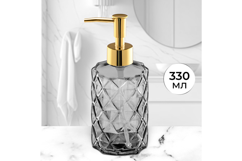 Стеклянный диспенсер подойдёт для хранения жидких моющих и очищающих средств. Размер изделия – 7,3х7,3х18 см, объём – 330 мл. Полупрозрачная поверхность диспенсера имеет графитовый цвет и украшена рельефным геометрическим узором. Дозатор золотого цвета изготовлен из пластика. Стильная баночка найдёт своё место на кухне, в ванной и даже в прихожей. Благодаря изящному дизайну она дополнит интерьер любой квартиры. Компактные размеры позволят разместить флакон на полке, столе или тумбочке. Залейте в ёмкость жидкое мыло, средство для посуды или антисептик. Можете наполнить диспенсер гелем для душа или шампунем и поставить в ванной. Не рекомендуется применять абразивные моющие средства. Поставляется в картонной упаковке. Настольный диспенсер – это не только практичное, но и стильное решение для организации чистоты и порядка в вашем доме. /