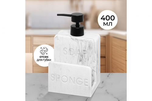 Диспенсер Elan Gallery "Мрамор" объёмом 400 мл и размером 10,8х9,5х18,5 см поможет создать чистоту и уют в вашем доме. Ёмкость выполнена из полирезина, дозатор с трубочкой – из пластика. Полирезин – это современный материал, который славится своей лёгкостью, устойчивостью к влаге и солнечным лучам. Он не выделяет вредных веществ. Высота бутылки без дозатора 14 см. Флакончик украшен надписью "Soap" ("Мыло"). Вместительный объём бутылочки позволит налить в неё достаточно жидкости, чтобы хватило для длительного использования. Для удобства органайзер имеет специальное отделение для губки, украшенное надписью "Sponge" ("Губка"). Губка в комплекте не поставляется. Стильный диспенсер с отсеком подойдёт для использования на кухне или в ванной комнате. Налейте в него моющее средство, гель для мытья посуды или жидкое мыло. Эргономичная форма позволяет разместить флакон с дозатором на раковине или полке. Универсальную бутылочку можно приспособить под антисептик. Просто поставьте её на стол, чтобы средство для дезинфекции было всегда под рукой. Ёмкость выполнена в стильном дизайне, имитирующим мраморное покрытие, поэтому украсит домашний интерьер. Не рекомендуется применять абразивные чистящие средства. Поставляется в стильной картонной коробке. Благодаря красочной коробочке не понадобится подарочная упаковка, если вы решите сделать подарок своим близким на праздник. Настольный диспенсер — это не только практичное, но и стильное решение для организации чистоты и порядка в вашем доме. В коллекции бренда Элан Галерея представлено много стильных товаров для дома. Выберите вариант на свой вкус!