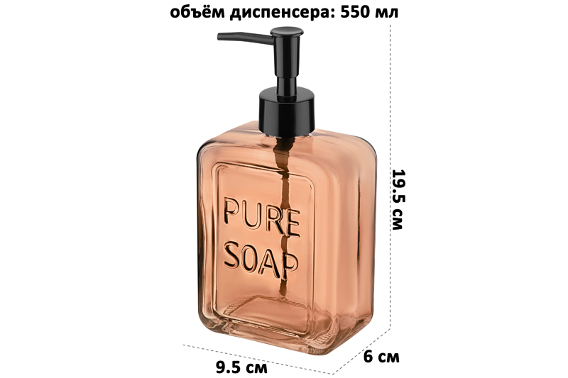 Диспенсер Elan Gallery "Коралловый" объёмом 550 мл и размером 6х9,5х19,5 см поможет организовать чистоту и уют в вашем доме. Выполнен из стекла и украшен надписью "Pure soap" ("Чистое мыло"). Объём стеклянной бутылочки 550 мл позволит налить в неё достаточно средства, чтобы хватило для длительного использования. Дозатор диспенсера выполнен из пластика. Поскольку бутылка изготовлена из прозрачного стекла, вы можете контролировать уровень жидкости и вовремя пополнять её запас. Стильный органайзер подойдёт для использования на кухне или в ванной комнате. Налейте в него моющее средство, гель для мытья посуды или жидкое мыло. Эргономичная форма позволяет разместить флакон с дозатором на раковине или полке. В ванной можете использовать его для геля для душа или шампуня. Универсальную бутылочку с дозатором можно приспособить под антисептик. Просто поставьте её на стол, чтобы средство для дезинфекции было всегда под рукой. Ёмкость квадратной формы выполнена в стильном дизайне и подойдёт для любого интерьера. Инструкция: не применять абразивные моющие средства. Избегать регулярного прямого контакта с водой (например, не хранить в душевой кабинке или на полке возле душа). Поставляется в картонной упаковке. Настольный диспенсер — это не только практичное, но и стильное решение для организации чистоты и порядка в вашем доме.