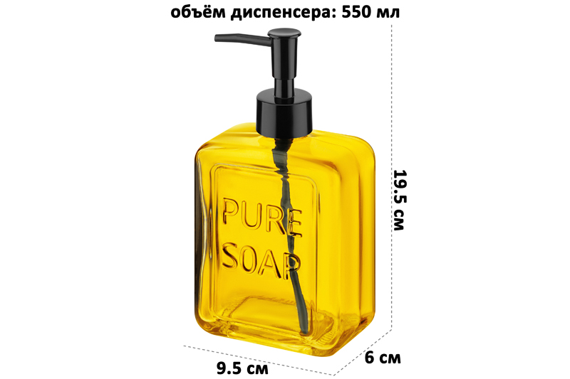 Диспенсер Elan Gallery "Жёлтый" объёмом 550 мл и размером 6х9,5х19,5 см поможет организовать чистоту и уют в вашем доме. Выполнен из стекла и украшен надписью "Pure soap" ("Чистое мыло"). Объём стеклянной бутылочки 550 мл позволит налить в неё достаточно средства, чтобы хватило для длительного использования. Дозатор диспенсера выполнен из пластика. Поскольку бутылка изготовлена из прозрачного стекла, вы можете контролировать уровень жидкости и вовремя пополнять её запас. Стильный органайзер подойдёт для использования на кухне или в ванной комнате. Налейте в него моющее средство, гель для мытья посуды или жидкое мыло. Эргономичная форма позволяет разместить флакон с дозатором на раковине или полке. В ванной можете использовать его для геля для душа или шампуня. Универсальную бутылочку с дозатором можно приспособить под антисептик. Просто поставьте её на стол, чтобы средство для дезинфекции было всегда под рукой. Ёмкость квадратной формы выполнена в стильном дизайне и подойдёт для любого интерьера. Инструкция: не применять абразивные моющие средства. Избегать регулярного прямого контакта с водой (например, не хранить в душевой кабинке или на полке возле душа). Поставляется в картонной упаковке. Настольный диспенсер — это не только практичное, но и стильное решение для организации чистоты и порядка в вашем доме.
