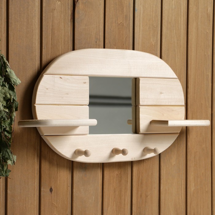 Такое зеркало подойдёт для бани и сауны. Дерево не выделяет вредных веществ при нагревании и подходит для помещений с высокой влажностью.