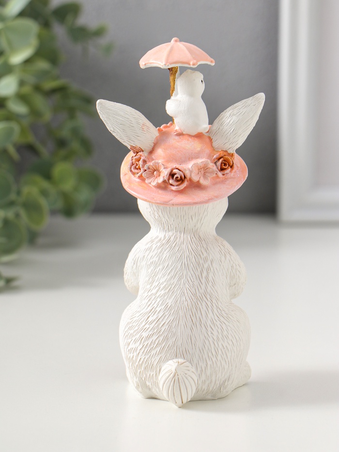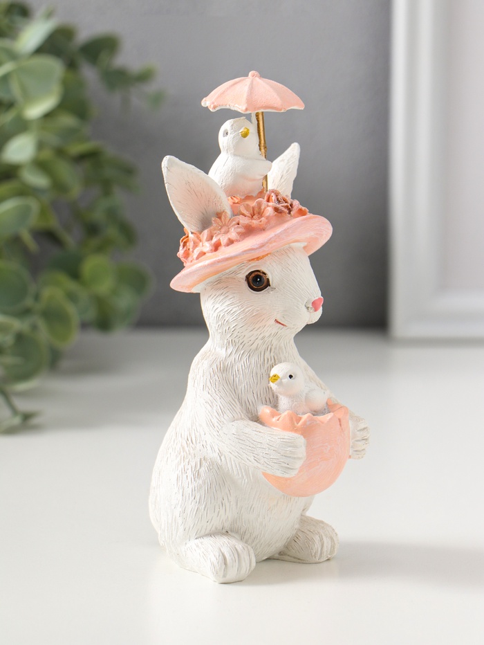 Фигурка белой зайки с цыплятами — олицетворение нежного весеннего настроения. Она станет трогательным подарком к Пасхе, 8 Марта или для создания уюта в интерьере в любое время года. Зайка в изящной шляпке, украшенной цветами, а сверху маленький цыпа с зонтиком, они словно сошли со страниц доброй сказки, чтобы принести в ваш дом тепло и светлую радость.