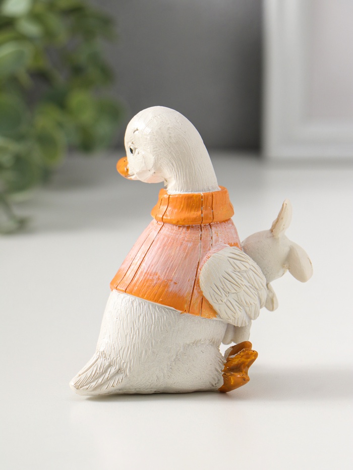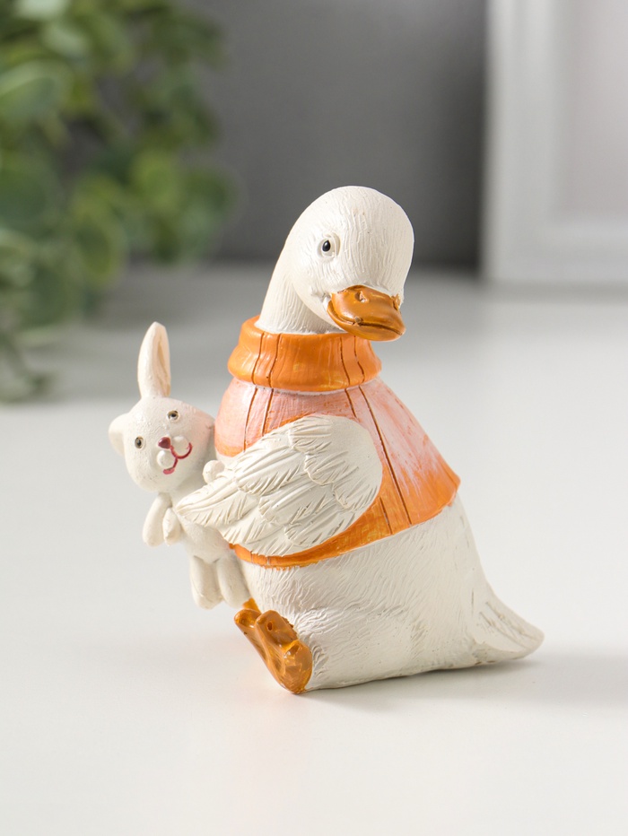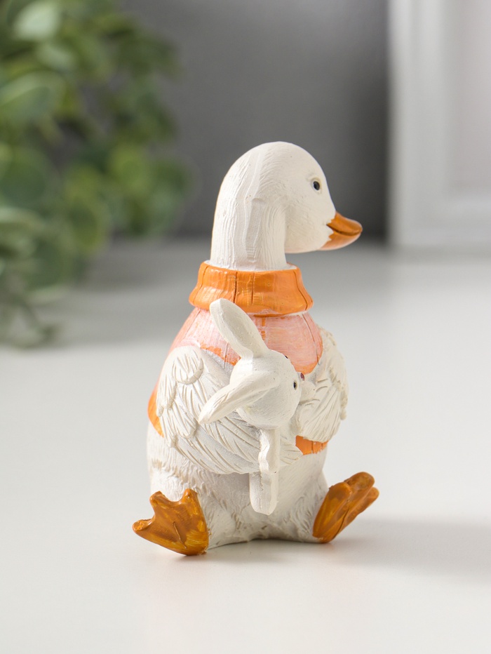 Этот белый утёнок в жилетке с зайчиком — трогательный символ детства, созданный для самых важных моментов. Фигурка из полистоуна станет милым акцентом в детской комнате или душевным подарком на рождение ребёнка, несущим тепло и уют.