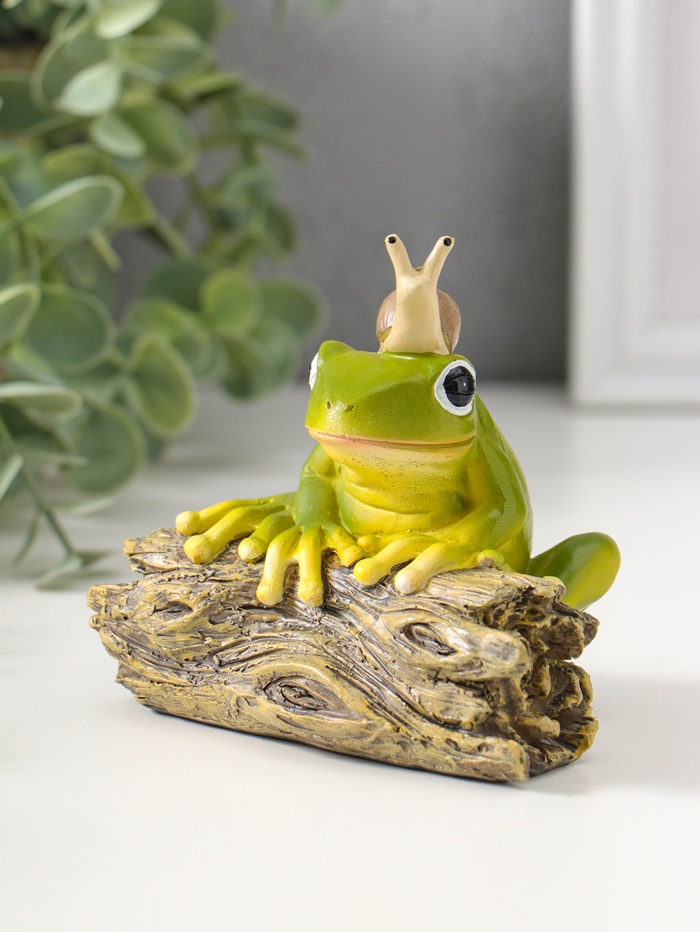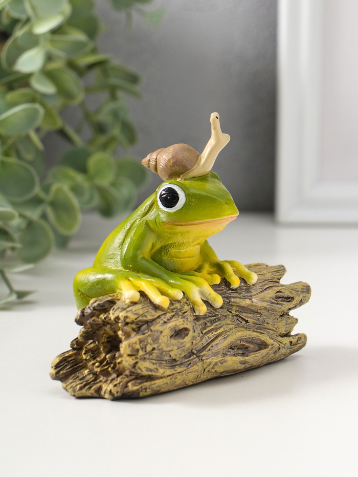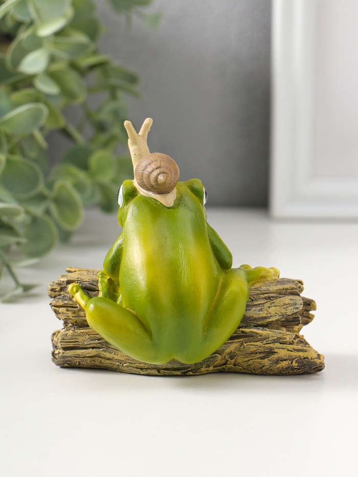 Эта зелёная фигурка лягушонка на коряге — очаровательный хранитель уюта. Мастер детализации поместил на голову героя крошечную улитку, создав сценку, полную безмятежности и лёгкого юмора. Универсальная тематика делает его идеальным спутником для книжной полки, рабочего стола или зелёного уголка в доме.