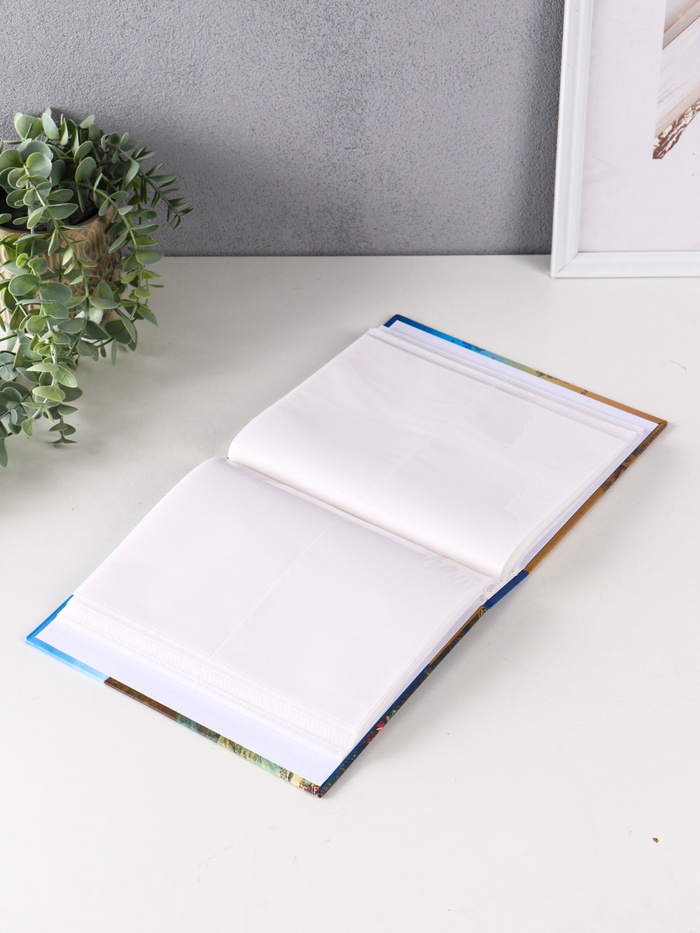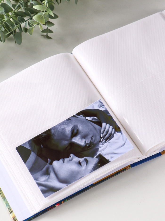 * Прозрачные кармашки из пластика: Фотографии размещаются в прозрачных кармашках. Белые листы-подложки делают каждый кадр выразительным, а защитная пленка предотвращает выпадение и защищает от пыли.