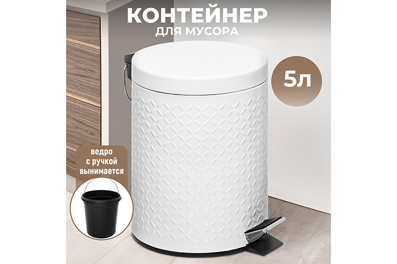 Контейнер для мусора предназначен для организации порядка в вашем доме. Размер изделия – 22,5х20х27,3 см, объём – 5 литров. Ёмкость белого цвета выполнена из металла, имеет внутри пластиковое ведро размером 20х20х21 см. Урна оснащена герметичной крышкой – она не пропустит запахов и не допустит выпадения мусора. Крышка открывается педальным механизмом. Педаль легко нажать – вам не потребуется прикладывать усилий. Внутреннее и внешнее ведро оснащены металлическими ручками, благодаря чему каждый элемент будет удобен для переноски. Маленькая компактная мусорка отлично послужит вам для уборки и наведения порядка – её легко взять с собой в нужную комнату. Подойдёт для уборки стола и полок, перебирания канцелярии и бумаг. Напольная урна найдёт своё место в любой части вашего дома. Поставьте её под рабочим столом или на кухне под раковиной, чтобы выбрасывать в неё кожуру, остатки еды или бумажные полотенца. Разместите в туалете и ванной комнате для утилизации гигиенических и косметических принадлежностей. Станет прекрасным помощником для любителей рукоделия – можно держать под рукой и с удобством избавляться от излишков материала. Подойдёт для размещения возле офисного стола. Аккуратный контейнер с неброским рельефным узором будет стильным дополнением любого интерьера. Не рекомендуется применять абразивные моющие средства. Компактная мусорная урна станет практичным дополнением вашего дома, офиса и дачи. /