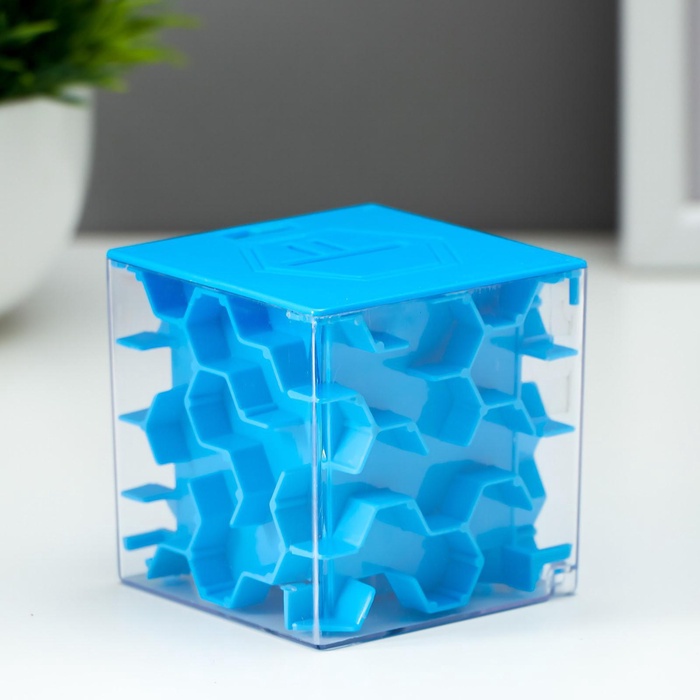 Копилка выполнена в виде прозрачного пластикового куба. Центральная ячейка, в которой и хранятся монеты, окружена лабиринтом с шариком. Для того чтобы копилка открылась, необходимо провести шарик по лабиринту к пружинке, которая открывает крышку копилки.