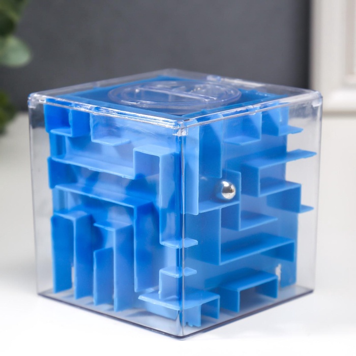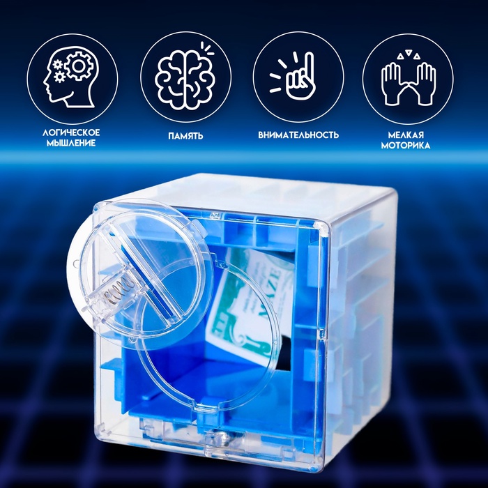 Копилка выполнена в виде прозрачного пластикового куба. Центральная ячейка, в которой и хранятся монеты, окружена лабиринтом с шариком. Для того чтобы копилка открылась, необходимо провести шарик по лабиринту к пружинке, которая открывает крышку копилки.