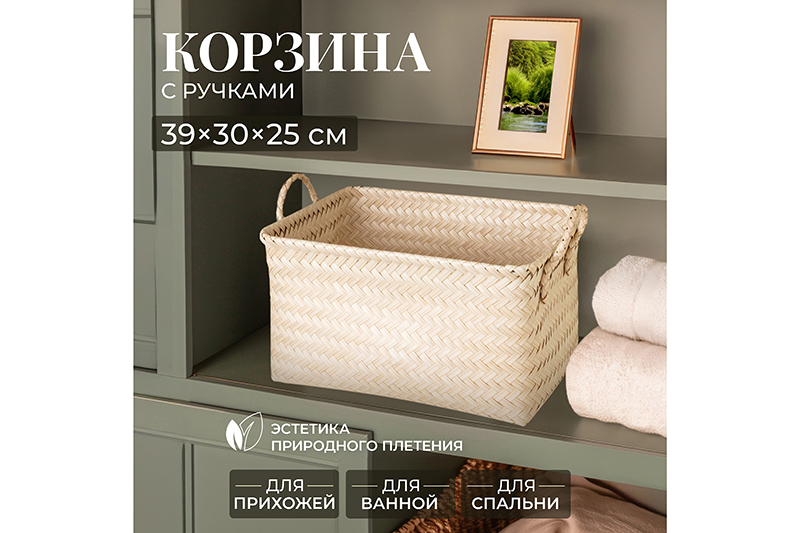 Большая белая корзинка с удобными ручками от бренда ELCASA станет незаменимым помощником на кухне, в прихожей или ванной комнате! Имеет прямоугольную форму и нежно-кремовый оттенок. Плетёные стенки органайзера выполнены из тончайших, но прочных элементов. Благодаря пластику в составе они не боятся влаги и легко протираются. Размер – 39х30х25 см. Плетёную корзину с мягкими и прочными стенками удобно использовать как контейнер для хранения белья, полотенец и пледов. Хозяйственный короб можно поставить возле раковины в ванной или стиральной машины, чтобы складывать в него одежду для стирки. Благодаря универсальному дизайну бельевая корзина подходит к любому стилю интерьера. Удобна для любых хозяйственных нужд, а также хранения предметов рукоделия, книг и разных мелочей. В детской комнате послужит переносным ящиком для игрушек благодаря 2 крепким ручкам. В ней вы можете хранить любые аксессуары в шкафу или гардеробной. Благодаря большой ёмкости позволит перевозить большое количество вещей на дачу. Не рекомендуется применять абразивные моющие средства. В нашем ассортименте представлено много функциональных товаров для дома, которые позволят компактно хранить ваши вещи и создать порядок в любом пространстве! /