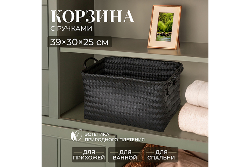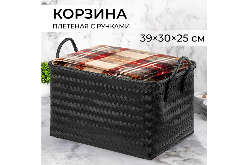 Большая чёрная корзинка с удобными ручками от бренда ELCASA станет незаменимым помощником на кухне, в прихожей или ванной комнате! Имеет прямоугольную форму. Плетёные стенки органайзера выполнены из тончайших, но прочных элементов. Благодаря пластику в составе они не боятся влаги и легко протираются. Размер – 39х30х25 см. Плетёную корзину с мягкими и прочными стенками удобно использовать как контейнер для хранения белья, полотенец и пледов. Хозяйственный короб можно поставить возле раковины в ванной или стиральной машины, чтобы складывать в него одежду для стирки. Благодаря универсальному дизайну бельевая корзина подходит к любому стилю интерьера. Удобна для любых хозяйственных нужд, а также хранения предметов рукоделия, книг и разных мелочей. В детской комнате послужит переносным ящиком для игрушек благодаря 2 крепким ручкам. В ней вы можете хранить любые аксессуары в шкафу или гардеробной. Благодаря большой ёмкости позволит перевозить большое количество вещей на дачу. Не рекомендуется применять абразивные моющие средства. В нашем ассортименте представлено много функциональных товаров для дома, которые позволят компактно хранить ваши вещи и создать порядок в любом пространстве! /