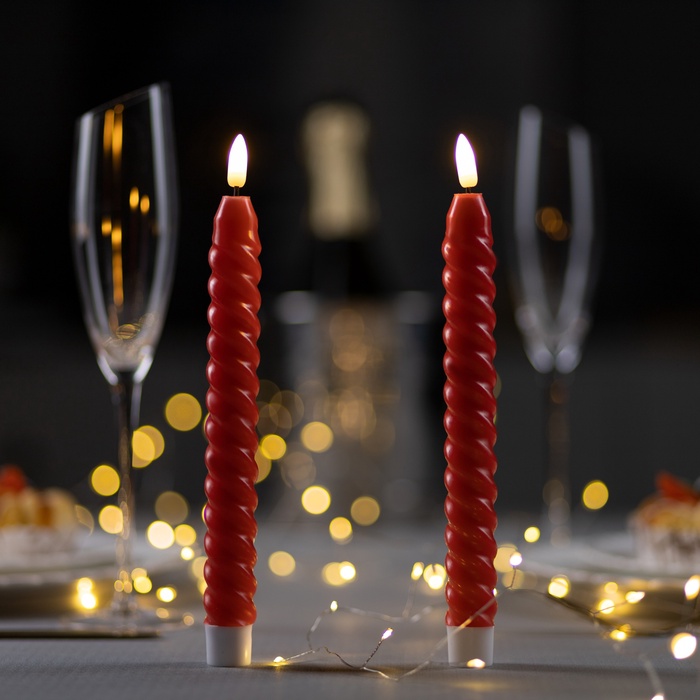 Набор светодиодных свечей, 2 шт., красные, 2×25×2 см, пластик, воск, от батареек АААх2, свечение тёплое белое