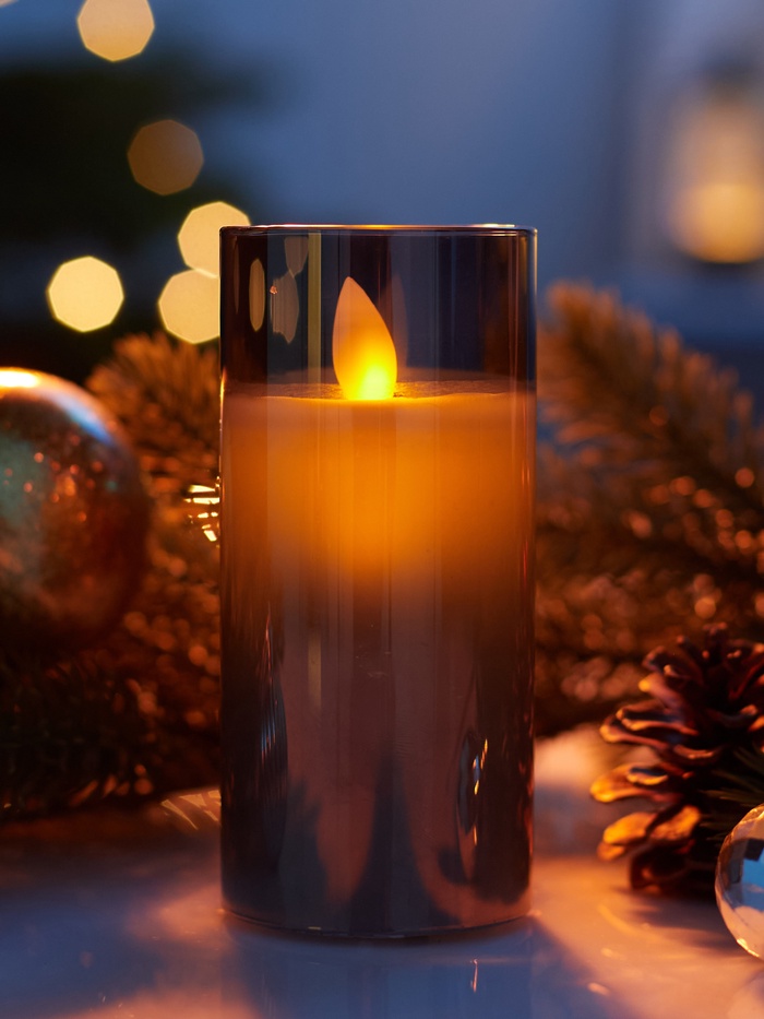 Серебристый оттенок этой светодиодной свечи в восковом стакане добавляет интерьеру современную элегантность и лёгкую нотку праздничного блеска. Компактные размеры — 12 × 5,5 см — позволяют гармонично разместить её на столе, полке или каминной полке, создавая атмосферу спокойствия и уюта.