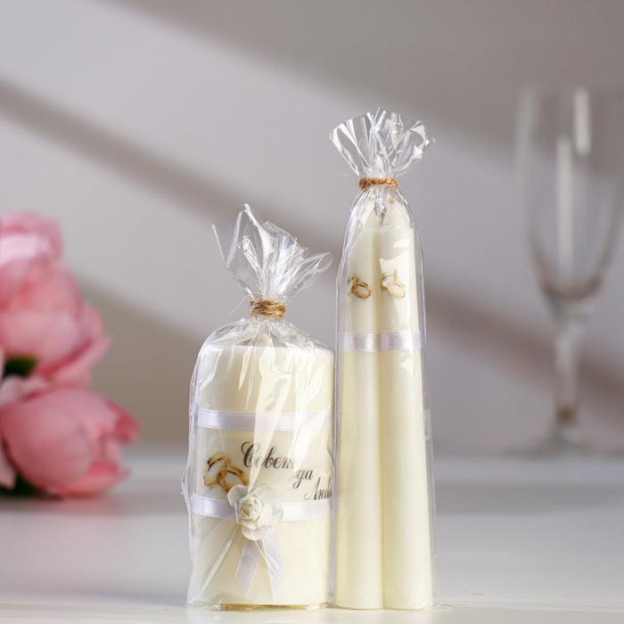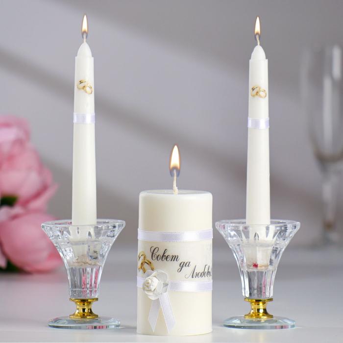 Набор свечей свадебных «Совет да любовь с розой», 3 шт.: белый, родительские 2 шт.-1.8×15 см; очаг 1 шт.-5.2×9.5 см