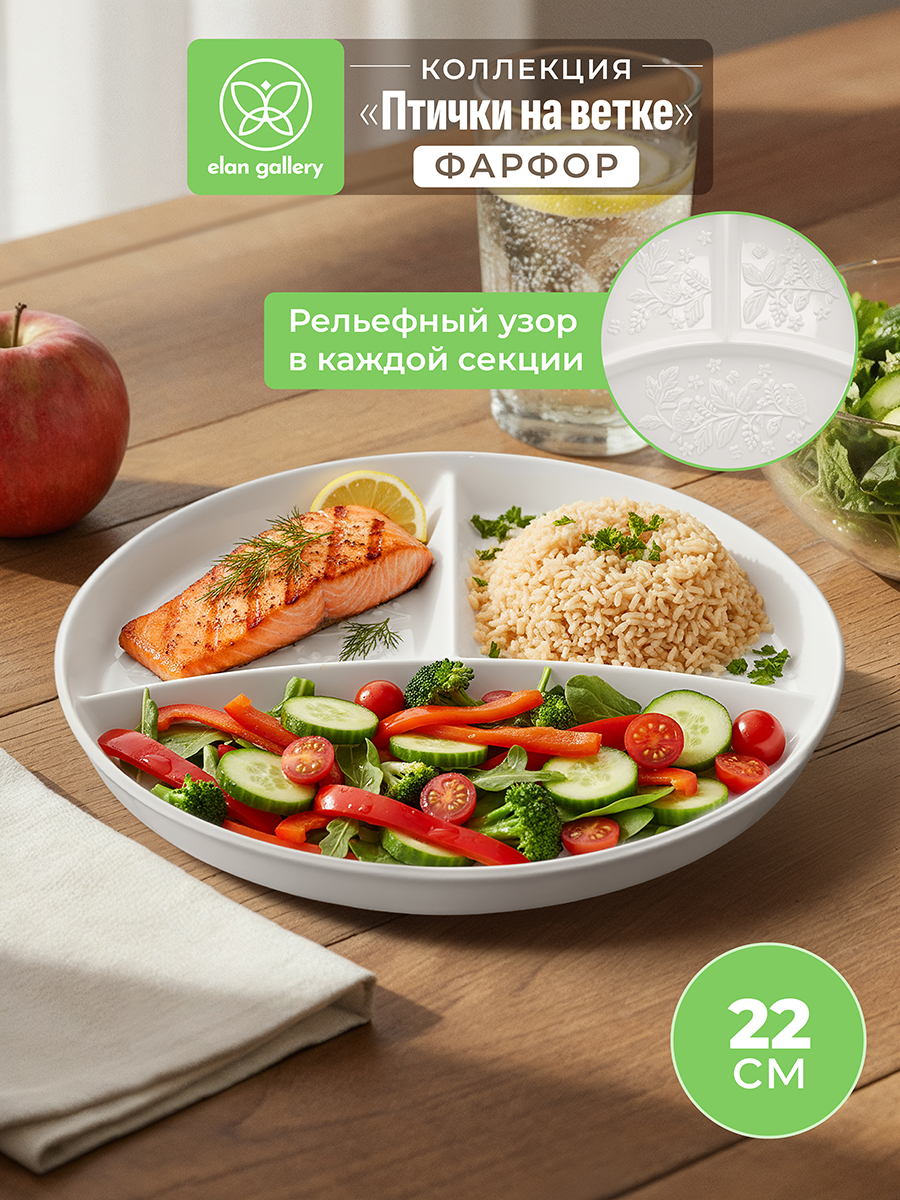 Секционная тарелка с бортиками для правильного питания от бренда Elan Gallery "Птички на ветке" размером 22х22х2,5 см имеет 3 секции и выполнена из белого фарфора. Представляет собой цельное блюдо с тремя отсеками: 1 объёмом 150 мл, 2 по 70 мл каждый. Посуда серии украшена рельефным узором в виде фигурок птичек на изящных веточках. Тарелка круглой формы с разделителями удобна для тех, кто ведёт здоровый образ жизни и придерживается диетического питания (ПП). Можно использовать как умную тарелку для похудения: разложите в отдельные секторы фрукты и овощи, белки и углеводы – чтобы спланировать свой рацион и контролировать порции. Такое приспособление позволит придерживаться диеты и не превышать допустимый уровень потребления калорий. Менажница подходит для стандартной сервировки и подачи различных закусок: сырной и мясной нарезки, канапе или роллов. Сервировочное блюдо пригодится, чтобы создать идеальную атмосферу для приема гостей или романтического ужина дома. Благодаря отдельным секциям вы можете использовать одну и ту же порционную тарелочку для солений, оливок, сыра и колбасы. Такой подход к сервировке позволит сэкономить место на вашем столе. Возьмите на пикник, эргономичная форма позволит разместить все необходимые закуски и сладости. Избегать резких перепадов температур и беречь от механических повреждений. Не рекомендуется применять абразивные моющие средства. Можно использовать в микроволновой печи и мыть в посудомоечной машине. Поставляется в красочной картонной упаковке. Эта менажница станет полезным подарком для хозяйки, которая ценит функциональные товары для дома и стильную сервировку, а также тех, кто увлекается фитнесом и хочет похудеть. Понравится любителям посуды в скандинавском стиле. Серия "Птички на ветке" позволит собрать сервиз в едином стиле и сможет стать настоящим украшением вашего дома. /