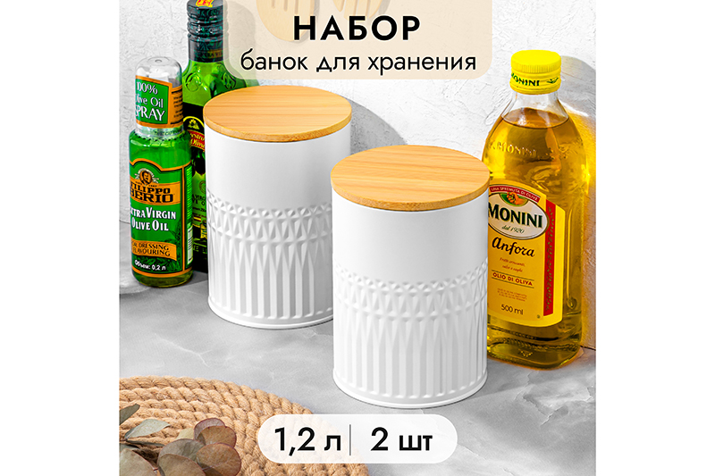 Набор 2 банок для сыпучих продуктов с бамбуковыми крышками от бренда Elan Gallery по 1,2 литра (каждая) станет удобным и эстетичным дополнением вашей кухни. Размер каждого изделия – 11х11х15,8 см, высота каждой банки без крышки – 15 см. Круглые ёмкости белого цвета выполнены из металла и плотно закрываются бамбуковыми крышками благодаря силиконовому уплотнителю. Ёмкости украшены рельефными узорами, поэтому позволят красиво хранить продукты на полке или в шкафу. Помогут хранить соль, специи, приправы, а также любые сладости. Благодаря стильному дизайну подходят для эстетичного хранения на столе, а также для сервировки печенья, мармелада или конфет. Комплект двух металлических контейнеров позволит не просто хранить чай, кофе и сахар на вашей кухне, но и станет элементом её декора. Кухонные баночки для сыпучих продуктов подойдут к интерьеру в любом стиле, от скандинавского до лофт. Не рекомендуется применять абразивные моющие средства. Нельзя использовать в микроволновой печи и посудомоечной машине. Бамбук нельзя замачивать. Поставляются в стильной картонной коробке. Набор посуды из 2 предметов станет украшением кухни или приятным подарком на любой праздник. Благодаря красочной коробочке не потребуется подарочная упаковка. В коллекции бренда Элан Галерея представлено много кухонных органайзеров, сахарниц, столового инвентаря и других стильных товаров для дома. Выберите вариант на свой вкус. /