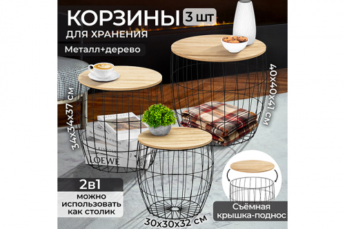 Набор металлических корзин ELCASA с деревянными крышками станет незаменимым помощником в организации домашнего пространства! В комплект входят корзинки: 40х40х41,5 (размер дна 32 см, высота без крышки 40,5 см), 34,5х34,5х37,5 см (размер дна 28 см, высота без крышки 36,5 см), 30х30х32,5 см (размер дна 22 см, высота без крышки 31,5 см). Благодаря универсальному дизайну гармонично впишутся в любой интерьер комнаты, прихожей и станут оригинальными предметами декора. Подходят для любых стилей интерьера: от сканди до лофт. Каждую можно использовать как маленький прикроватный или журнальный стол в спальне и гостиной. Округлые органайзеры чёрного цвета выполнены из металла, имеют стенки в виде металлической сетки. Можно приспособить как балконный столик и сложить в декоративную корзинку плед и книги. Компактный органайзер не займёт много места даже на маленьком балконе! Сетчатая корзинка с крышкой из натурального дерева подходит для хранения любых вещей: от аксессуаров до домашних тапочек. На кухне в универсальном контейнере можно хранить кухонные и хозяйственные принадлежности. Используйте ёмкость для косметики, бытовой химии и моющих средств. Короб может быть использован для белья, полотенец и хранения различных мелочей, например, канцелярии и журналов. Можно поставить в ванной в роли бельевой корзины или тумбы. Не имеет острых углов, поэтому подойдёт для хранения игрушек в детской комнате. В коллекции бренда ELCASA представлено много функциональных товаров для дома со стильным дизайном! /