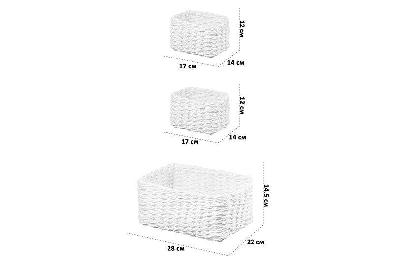 Набор 3 плетеных корзин, 1 корзинка 28*22*14,5 см, 2 корзинки 17*14*12 см, белый