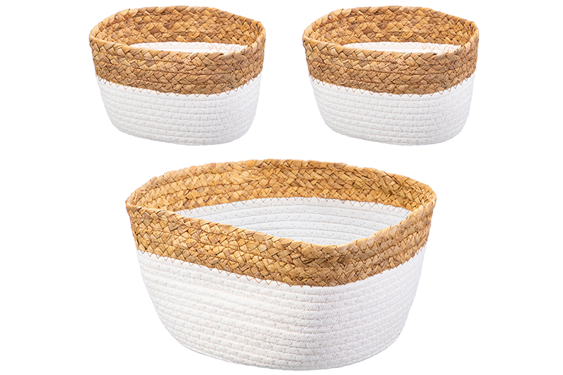 Набор 3 плетёных корзинок от ELCASA предназначен для практичной системы хранения вещей в вашем доме. Включает изделия разных размеров: одну корзинку 30х25х14 см и две корзинки 22х14х12 см. Корзины выполнены из натуральных материалов: водного гиацинта и хлопчатобумажной ткани. Прочный и гибкий гиацинт придаёт изделиям лёгкость, износостойкость и характерную натуральную фактуру. Мягкая и плотная хлопчатобумажная ткань помогает корзинке сохранять форму и безопасна для использования даже в детской комнате. Она легко очищается и приятна на ощупь. Благодаря сочетанию этих материалов корзины не только практичны, но и эстетичны. Бежево-белый цвет изделий впишет их в интерьер любой квартиры или дачи, создавая атмосферу уюта и порядка. Различие органайзеров по размеру позволит разделить аксессуары на категории и облегчит их поиск. Используйте их для проводов от зарядных устройств, наушников, заколок и резинок для волос. Контейнеры создадут уют в любой комнате. В прихожей они помогут хранить ключи, перчатки и визитки. В спальне заполните их кремами, ватными дисками или ушными палочками. Расположите на туалетном столике под наборы для макияжа, инструменты для маникюра, уходовую косметику и ювелирные подвески. На кухне храните в них баночки для приправ и специй, кухонные полотенца или прихватки. Приспособьте для художественных принадлежностей и приборов для рукоделия: кисточек, ниток или пряжи. Настольные органайзеры послужат в качестве офисных, помогая держать под рукой канцелярию – ручки, карандаши и блоки записных листов. Не рекомендуется применять абразивные моющие средства. Корзиночки от бренда ЭЛЬКАСА станут практичным и оригинальным подарком для близких, друзей и коллег, а также универсальным дополнением вашего дома. С ними доступ к вашим вещам станет простым и удобным!