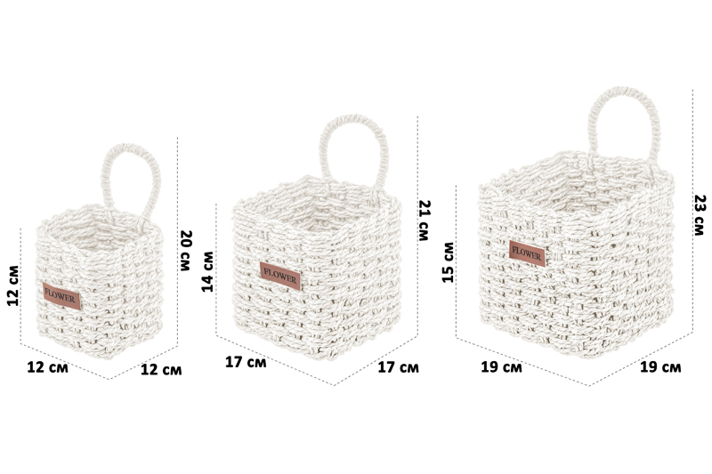 Набор 3 плетёных корзинок от ELCASA предназначен для организации практичной системы хранения вещей в вашем доме. Включает изделия разных размеров: 12х12х12 см (высота с ручкой – 20 см), 17х17х14 см (высота с ручкой – 21 см) и 19х19х15 см (высота с ручкой – 23 см). Выполнены из натуральных материалов с декоративным плетением, которое визуально напоминает ротанг и перекликается с эстетикой изделий из джутовых нитей. При этом корзины сохраняют свою лёгкость и экологичность. Лаконичный белый цвет придаёт им элегантный вид, делая не только функциональными, но и привлекательными элементами декора и стильным дополнением вашего интерьера. Изделия оснащены надёжными ручками, которые позволят хранить их в подвешенном виде. Поверхность изделий украшена декоративными ярлыками с фигурной надписью «Flower» («Цветок»). Различие органайзеров по размеру позволит разделить аксессуары на категории и облегчит их поиск. Используйте их для проводов от зарядных устройств, наушников, заколок и резинок для волос. Контейнеры создадут уют в любой комнате. Разместите их на полке для хранения разнообразных мелочей. В прихожей они помогут компактно сложить ключи, перчатки и визитки. В спальне заполните их кремами, ватными дисками или ушными палочками. Расположите на туалетном столике под наборы для макияжа, инструменты для маникюра, уходовую косметику и ювелирные подвески. Приспособьте для художественных принадлежностей и приборов для рукоделия: кисточек, ниток или пряжи. Настольные органайзеры послужат в качестве офисных, помогая держать под рукой канцелярию – ручки, карандаши и блоки записных листов. Не рекомендуется применять абразивные моющие средства. Корзиночки от бренда ЭЛЬКАСА станут практичным и оригинальным подарком для близких, друзей и коллег, а также универсальным дополнением вашего дома. С ними доступ к вашим вещам станет простым и удобным!