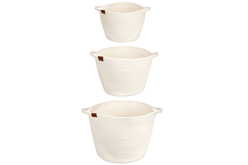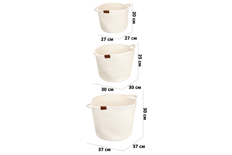 Набор 3 плетёных корзин от ELCASA предназначен для организации системы хранения вещей в вашем доме. Включает изделия разных размеров: 27х27х20 см (размер дна – 22,5х22,5 см), 30х30х25 см (размер дна – 25,5х25,5 см), 37х37х30 см (размер дна – 29х29 см). Стенки представляют собой плетение из хлопкового шнура. Благодаря элегантному дизайну и универсальному белому цвету набор станет не только практичным, но и привлекательным элементом декора и стильным дополнением вашего интерьера. Эстетичные плетёные корзиночки послужат контейнерами для хранения мелочей и аксессуаров. Они помогут создать уют в любой части вашей квартиры. В прихожей храните в них шарфы, зонты, шапки и перчатки. В спальне компактно сложите тапочки, наволочки и подушки. Расположите их в детской комнате под игрушки или книги, на кухне – под кухонные полотенца или фартуки. Приспособьте их под художественные принадлежности и приборы для рукоделия: альбомы, кисточки, нитки и пряжу. Послужат в качестве офисных, позволяя держать под рукой папки и документы. Благодаря прочным ручкам даже наполненные контейнеры будет удобно переносить. Не рекомендуется применять абразивные моющие средства. В коллекции бренда ЭЛЬКАСА представлены разнообразные товары для дома, которые привнесут в ваш быт практичности и стиля.