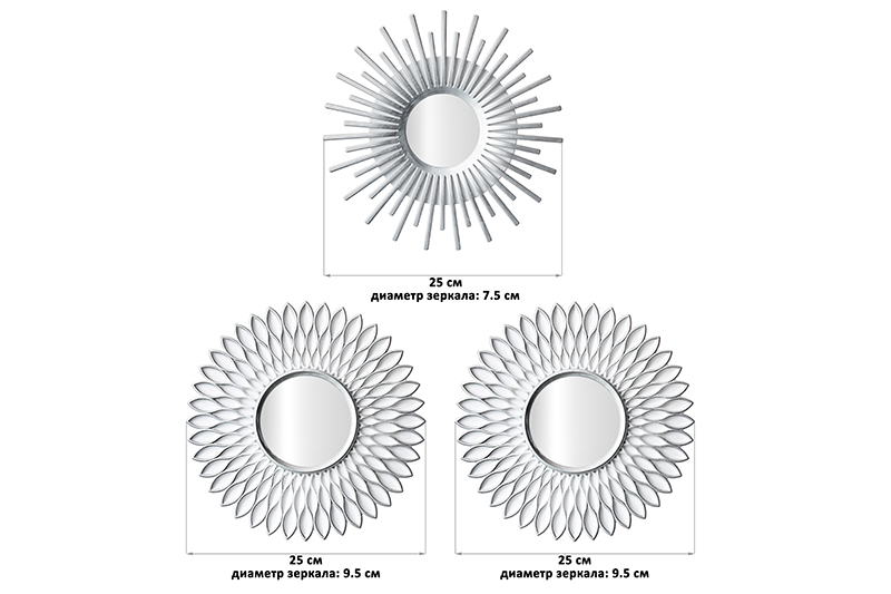 Набор 3 подвесных интерьерных зеркал от бренда ELCASA — это стильное дизайнерское решение для украшения вашего дома. В комплект входят 3 небольших зеркала в фигурных рамах белого цвета с элементами серебристого цвета. Общий размер каждого зеркальца вместе с ажурным декором на рамочке — 25х25х1,5 см. Диаметры круглых мини-зеркал без рамок: два по 9,5 см и одно 7,5 см. Декоративные рамы изделий выполнены из пластика и имеют форму солнышка с ажурными и прямыми лучиками. Покрытие серебряного цвета на деталях изделия создаёт эффект благородного сияния. Оно как утренний иней: лёгкое и едва уловимое на свету. Маленькие украшения крепятся на стену за счёт подвеса в виде петельки с обратной стороны. Благодаря пластиковым рамкам каждое изделие лёгкое по весу, а значит будет отлично держаться даже на небольшом креплении. Маленькое зеркальце в виде солнца преобразит любое пространство в квартире или на даче. Оно подойдёт к разному интерьеру, особенно понравится любителям стилей бохо и винтаж. Зеркальными украшениями можно оформить зону прихожей, гостиной или спальни. Также они органично смотрятся в ванной, коридоре и даже на двери. Если разместить напротив окна, будут красиво отражать свет и играть солнечными бликами по комнате. Можно использовать по отдельности или объединить в декоративное панно, создав красивую композицию на стенке. Каждое зеркальце подойдёт в роли косметического для нанесения макияжа, особенно в зоне туалетного столика. Не рекомендуется применять абразивные моющие средства. Эстетичный набор для декорирования — это приятный подарок на любой праздник. Поставляется в картонной коробке. В коллекции бренда ELCASA представлено много стильных товаров для дома. Выберите варианты на свой вкус и добавьте эстетики любому пространству!