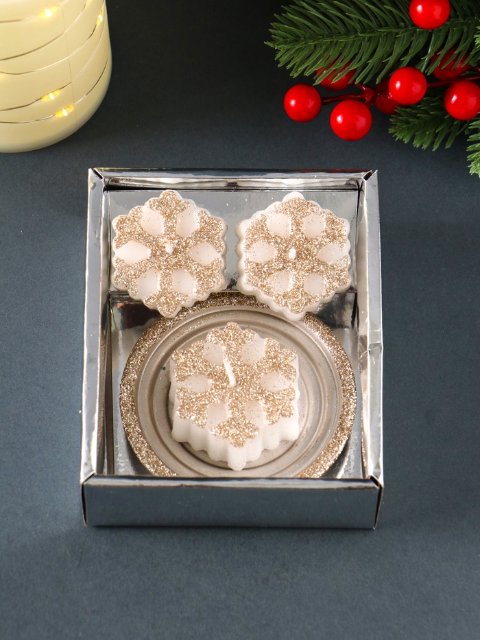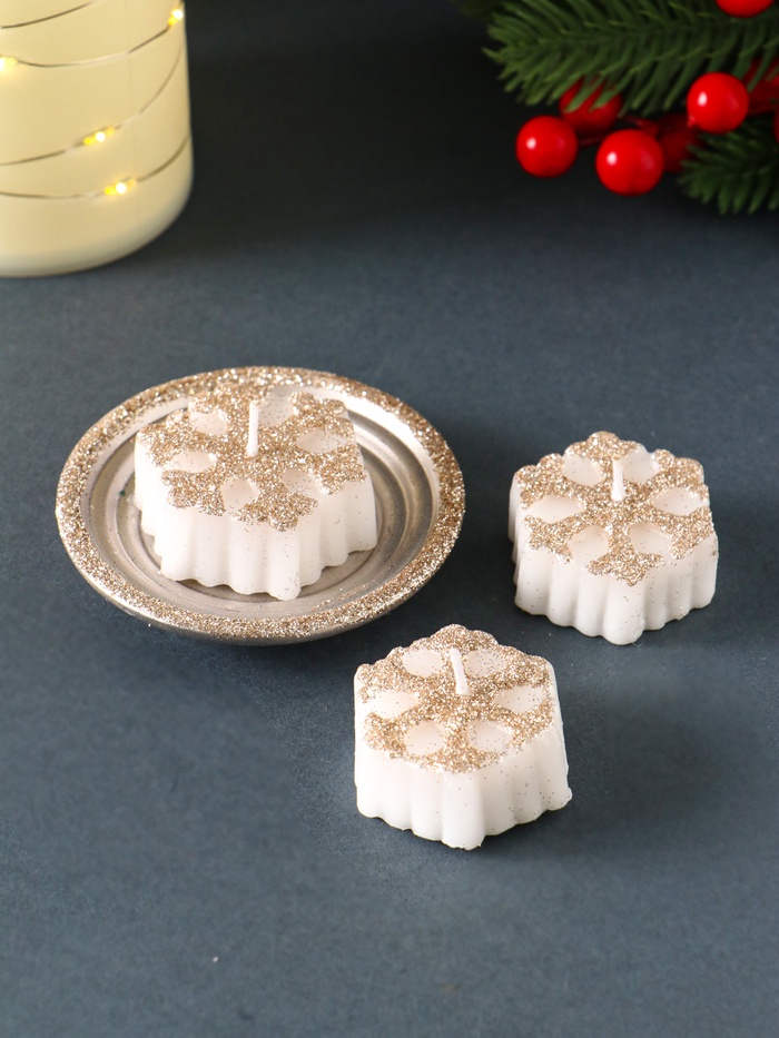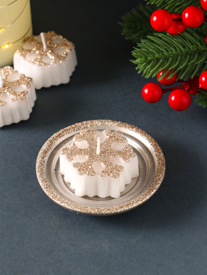 * Элегантный дизайн: белые свечи с узорами в виде снежинок и стильный подсвечник создают атмосферу зимнего волшебства.