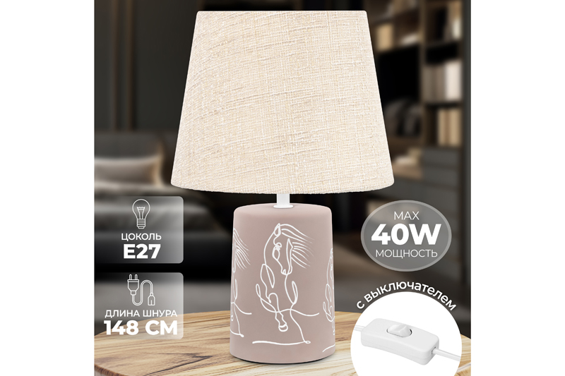 Настольная лампа с бежевым абажуром от Elan Gallery — это не только дополнительный источник света, но и стильное украшение интерьера спальни или гостиной. Размер – 22х22х35 см. Основание цвета кофе с молоком выполнено из керамики и украшено рельефными изображениями лошадей. Диаметр нижней части подставки 10,5 см. Размеры абажура: диаметр по верху 16,5 см, диаметр по низу 22 см, высота 17,5 см. Рекомендуется использовать лампочку мощностью не более 40 W (в комплект не входит). Работает от сети, необходимо наличие розетки. Длина провода 148 см. Благодаря стильному дизайну добавит элегантности вашему интерьеру! Декоративный светильник поможет создать уютную атмосферу в комнате или на кухне. Он подходит для использования в качестве ночника, а также прикроватного светильника. Станет отличным предметом декора для вашего комода или журнального столика. Прекрасно впишется в интерьер детской комнаты, создавая уютную атмосферу для школьника. Можно поставить на туалетный столик возле кровати для спокойного чтения книг перед сном. На даче небольшой ночной светильник поможет создать приятную атмосферу на террасе или в доме. Поставьте красивую лампу на стол или тумбочку, чтобы организовать дополнительную подсветку в любом пространстве. Фигурная настольная лампа станет приятным подарком на любой праздник как взрослым, так и детям. Не рекомендуется использовать абразивные моющие средства. Светильник с керамическим основанием — это не просто источник освещения, он украсит интерьер вашего дома и поможет создать уютную атмосферу! В ассортименте Elan Gallery представлено много товаров и предметов декора, которые позволят создать уголок гармонии для комфортного отдыха дома.