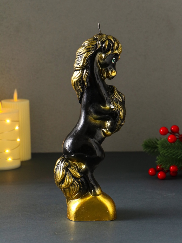Эта скульптурная свеча в виде вздыбленного коня станет сильным акцентом в интерьере. Её лаконичная чёрная форма и внушительный размер создают атмосферу благородства и стиля, притягивая взгляды даже в незажжённом состоянии.