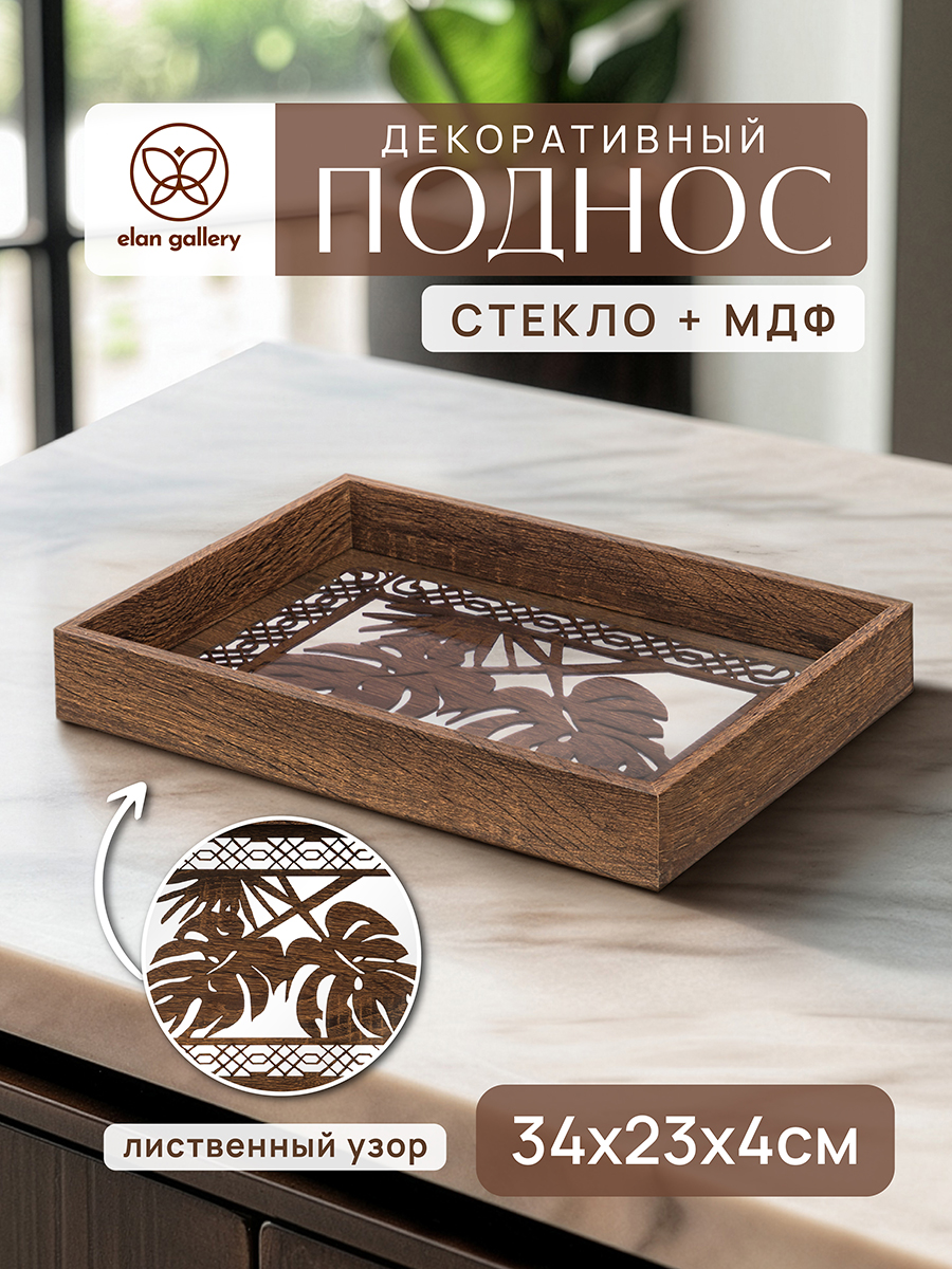 Прямоугольный поднос от бренда Elan Gallery "Листья" размером 34,5х23,5х4,5 см выполнен из прозрачного стекла. Декоративные элементы в виде резных узоров коричневого цвета выполнены из МДФ. Изделие подойдет для подачи блюд в разные комнаты и сервировки обеденного стола, а также украшения интерьера декоративными композициями. В спальне на подносе можно хранить косметику или журналы, поставив его на стол. Проведите уютный вечер на веранде с вином и фруктами, чайную церемонию с друзьями или устройте завтрак в постель. Поднос можно использовать как подставку для предметов декора. Создавайте красивые декоративные композиции со свечами, цветами и интерьерными аксессуарами. Многофункциональный поднос можно использовать для организации хранения. Разместите на кухне чай, кофе, специи и различную утварь. В спальне подойдёт для парфюмерии и косметических принадлежностей, а в прихожей под любые мелочи. Запрещено использовать в качестве подставки для раскаленных сковород, кастрюль, противней. Не рекомендуется применять абразивные моющие средства. Станет оригинальным подарком для любителей эстетичных вещей на любой праздник. В коллекции бренда Элан Галерея представлено много красивой посуды и стильных товаров для дома, выберите варианты на свой вкус!
