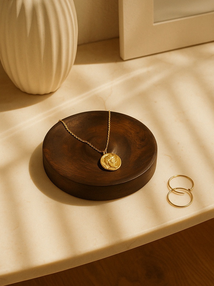 Эта компактная деревянная подставка выполнена в форме аккуратного круга с конусообразным профилем, что делает её идеальным решением для хранения и организации украшений. Её натуральный коричневый оттенок и гладкая текстура подчёркивают естественную красоту дерева, добавляя тепла и уюта в любой интерьер.