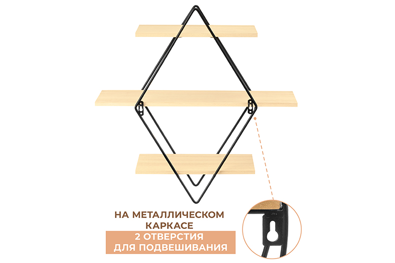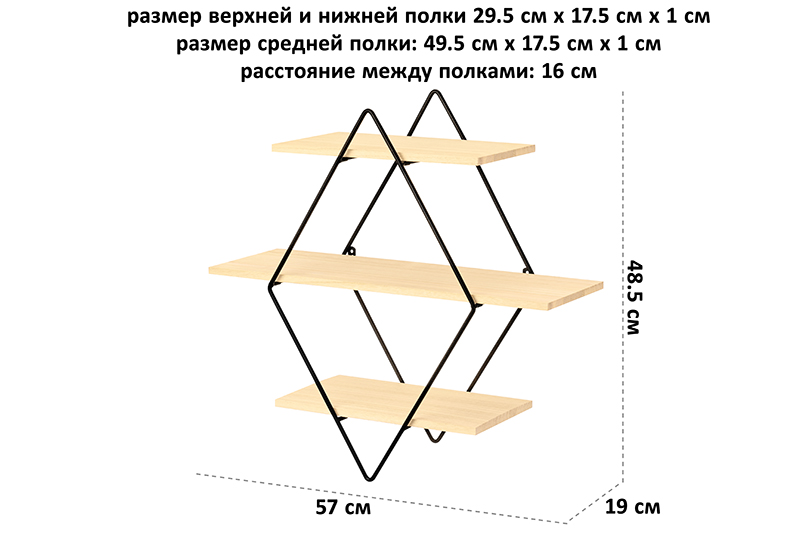 Подвесная трёхъярусная полка выполнена из дерева и металла. Размер – 57х19х48,5 см. Размер верхней и нижней полки – 29,5х17,5х1 см, средней – 49,5х17,5х1 см. Расстояние между полками – 16 см. Металлический держатель чёрного цвета имеет форму ромба, а его полочки расположены ассиметрично, что придаёт изделию оригинальности, несмотря на минималистичный дизайн. Настенная полочка украсит интерьер вашей прихожей, кухни или коридора и поможет держать под рукой всё необходимое. На железном каркасе есть отверстия для подвешивания. Узкую полку с 3-мя деревянными ярусами можно повесить в квартире, на даче, в гараже или офисе для хранения разных вещей и создания уютной атмосферы. Компактную полочку можно разместить над любой мебелью, стиральной машиной или под зеркалом в гостиной, чтобы эффективно использовать каждый сантиметр пространства и организовать порядок. Используйте её для статуэток, украшений, рамок с фотографиями, ключей и предметов декора. В спальне или ванной можно использовать как туалетный уголок для баночек с кремами, шампуней, косметики и маникюрных принадлежностей, например, лаков для ногтей. Открытая полка подойдёт для интерьера в любом стиле, от классического до лофт, удобна для хранения аксессуаров. Используйте в детской комнате как подставку под игрушки, а также для создания декоративных композиций. Подойдёт для любых кухонных мелочей: банок со специями, бутылок с маслом или кружек. Стильная деревянная полочка с железным креплением станет приятным подарком для ваших близких и позволит разместить на ней любые сувениры. Не рекомендуется применять абразивные моющие средства. Настенный органайзер позволит хранить все необходимые мелочи в одном месте и станет помощником для организации порядка в любом пространстве.