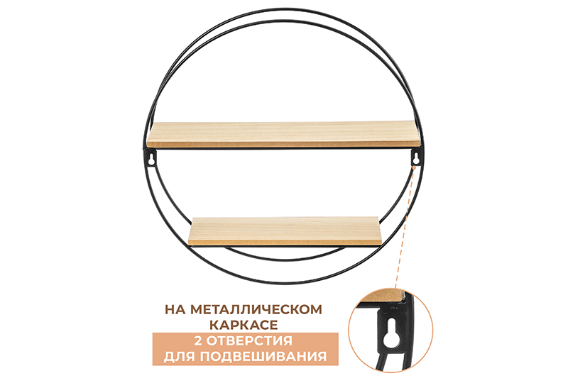 Подвесная двухъярусная полка 40х10х40 см выполнена из дерева и металла. Металлический держатель чёрного цвета имеет круглую форму, что придаёт изделию оригинальности несмотря на минималистичный дизайн. Размер нижнего яруса 28х10х1 см, размер верхнего яруса 39х10х1 см, расстояние между полками 14 см. Настенная полочка украсит интерьер вашей прихожей, кухни или коридора и поможет держать все нужные мелочи под рукой. На железном каркасе есть отверстия для подвешивания. Узкую полку с 2 деревянными ярусами можно повесить в квартире, на даче, в гараже или офисе для хранения разных вещей и создания уютной атмосферы. Компактную полочку можно разместить над любой мебелью, стиральной машиной или под зеркалом в гостиной, чтобы эффективно использовать каждый сантиметр пространства и организовать порядок. Используйте её для статуэток, украшений, рамок с фотографиями, ключей и предметов декора. В спальне или ванной можно использовать как туалетный уголок для баночек с кремами, шампуней, косметики и маникюрных принадлежностей (например, лаков для ногтей). Открытая полка подойдёт для интерьера в любом стиле, от классического до лофт, удобна для хранения аксессуаров. Используйте в детской комнате как подставку под игрушки, а также для создания декоративных композиций. Можно использовать для любых кухонных мелочей: банок со специями, бутылок с маслом или кружек. Стильная деревянная полочка с железным креплением станет приятным подарком для ваших близких и позволит разместить на ней любые сувениры. Не рекомендуется использовать абразивные моющие средства. Настенный органайзер позволит хранить все необходимые мелочи в одном месте и станет помощником для организации порядка в любом пространстве.