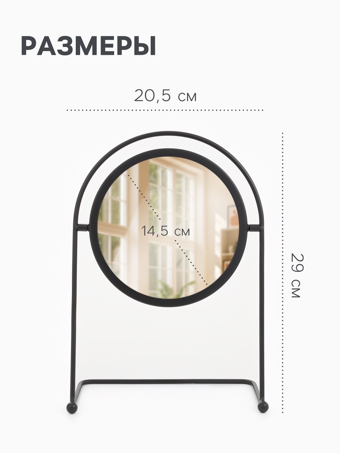 Подставка зеркала обеспечит надежную устойчивость, позволяя удобно использовать его для нанесения макияжа, причесок или просто для визуального контроля своего внешнего вида. Размер зеркала позволяет увидеть не только лицо, но и частично верхнюю часть тела, что особенно удобно при укладке волос или использовании аксессуаров.