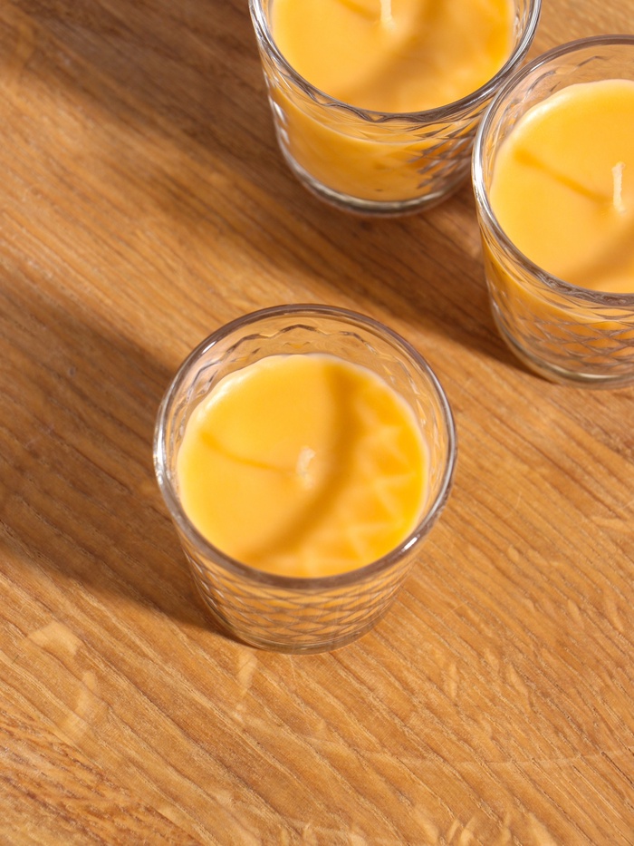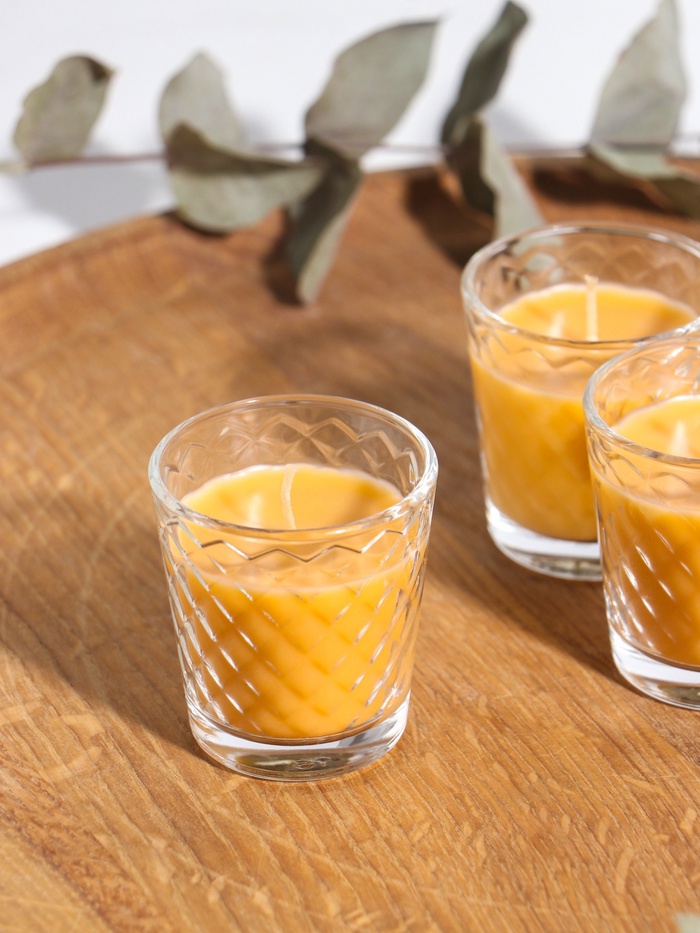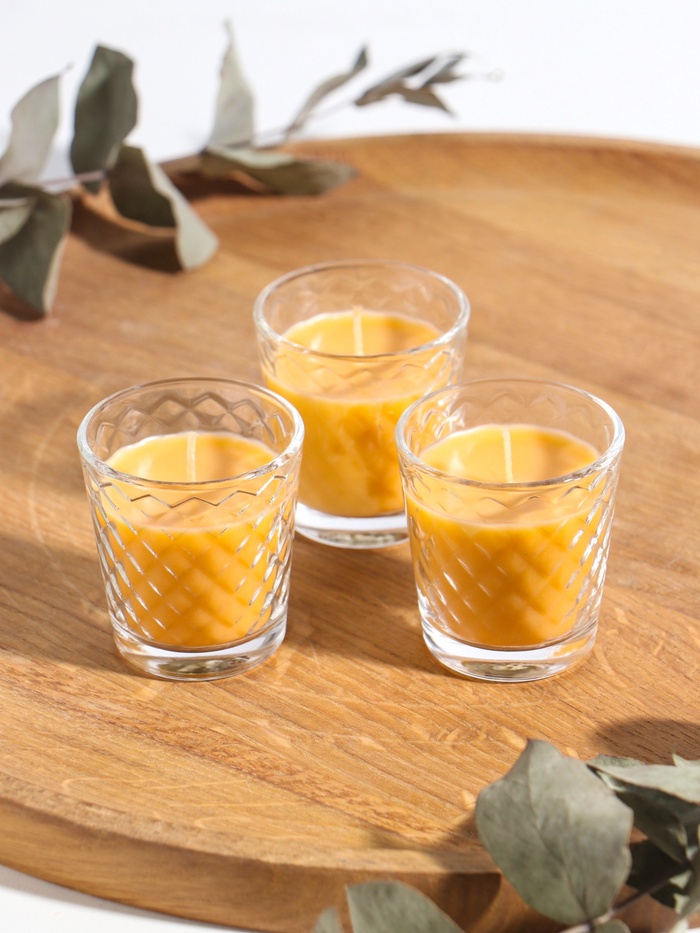 Каждая из трёх свечей заключена в стильный стакан оранжевого цвета, который не только защищает воск от внешних воздействий, но и добавляет элегантности любому интерьеру. Идеальные размеры делают их удобными для размещения на полках, столах или даже в качестве подарка близким людям.