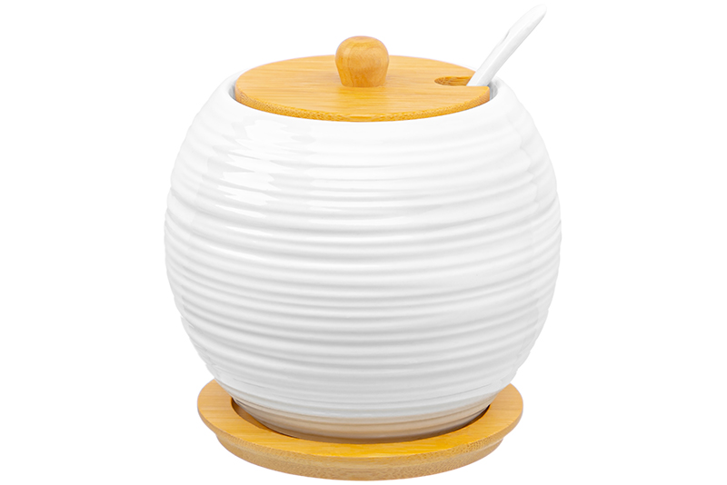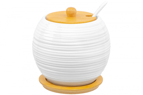 Сахарница Elan Gallery "Шёлк" объёмом 450 мл с ложкой выполнена из белого фарфора и украшена изящным рельефным узором. Общий размер набора – 10,5х10,5х10,5 см. Крышка и подставка баночки выполнены из натурального бамбука. Размер сахарницы без крышки и подставки – 10,5х10,5х9 см. Ёмкость подойдёт для хранения сахара, а также других продуктов, таких как варенье, мёд и даже икра. Фарфоровая баночка с ложечкой станет отличным элементом декора вашей кухни! Можно использовать для хранения специй и приправ, чтобы во время приготовления пищи все было под рукой. Без бамбуковых крышки и подставки можно использовать в микроволновой печи и посудомоечной машине. Изделия из бамбука нельзя замачивать! Поставляется в стильной картонной упаковке. Подарочная фарфоровая баночка порадует ваших близких на любой праздник. Кухонный инвентарь с рельефным рисунком станет незаменимым помощником при сервировке стола и предметом декора вашего дома! /